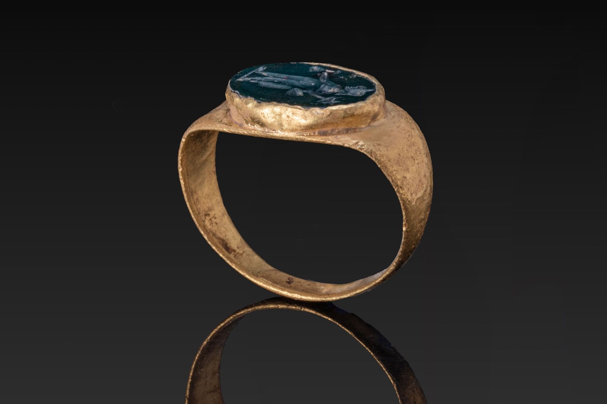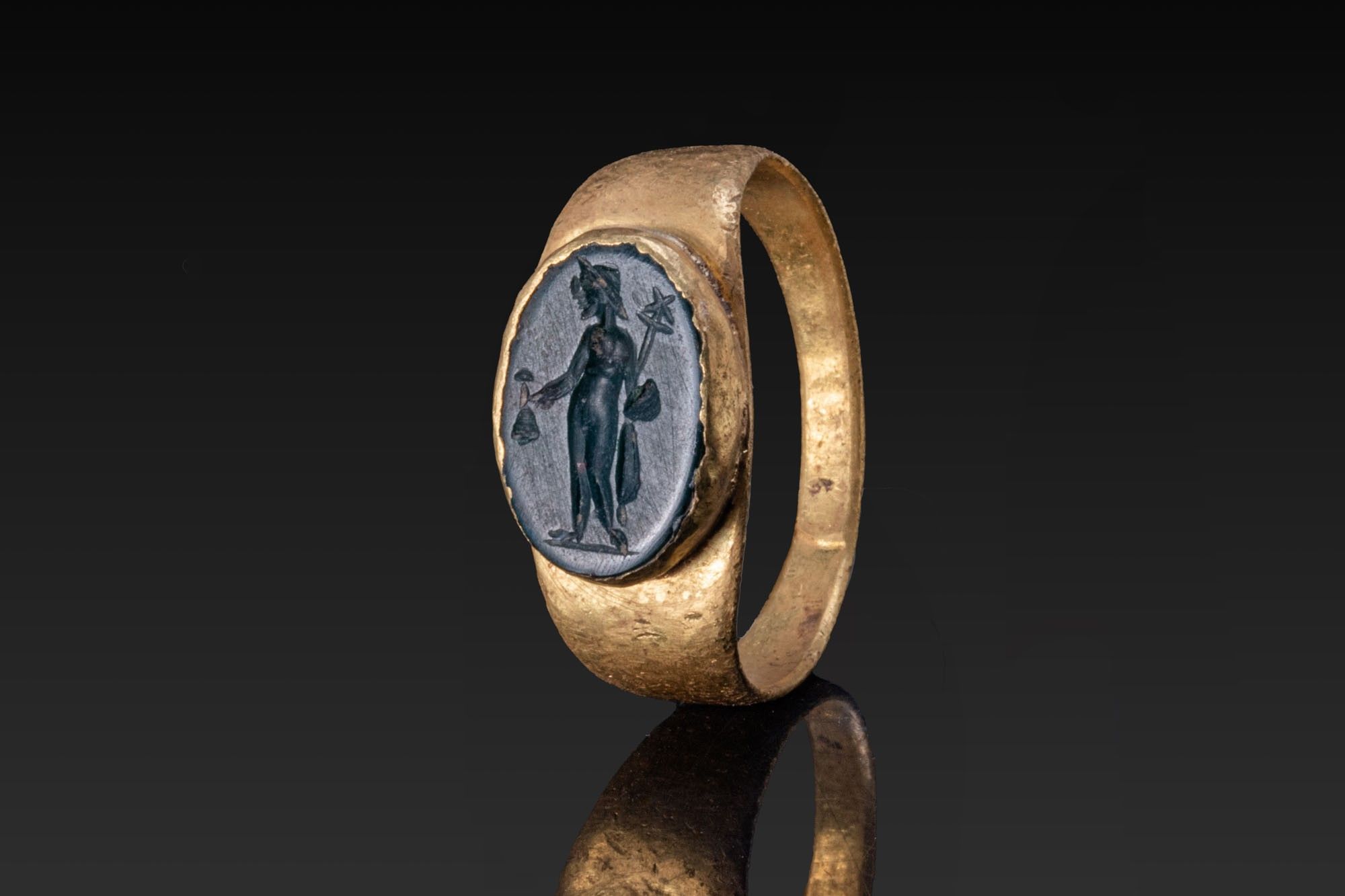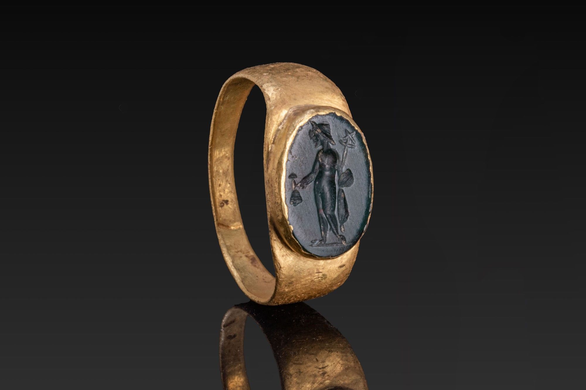 ROMAN GREEN JASPER INTAGLIO DEPICTING MERCURY HOLDING A MONEY BAG IN GOLD RING.