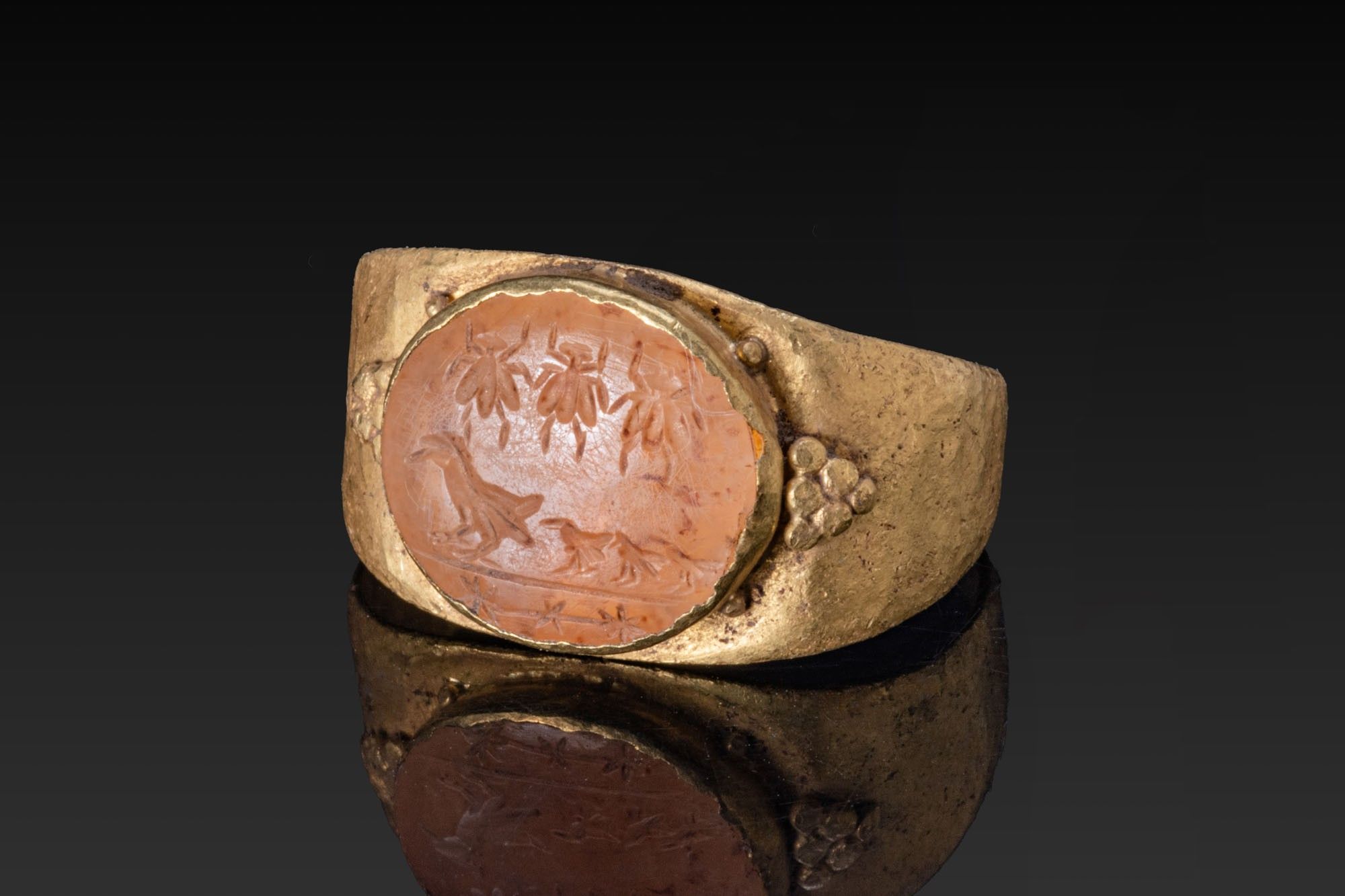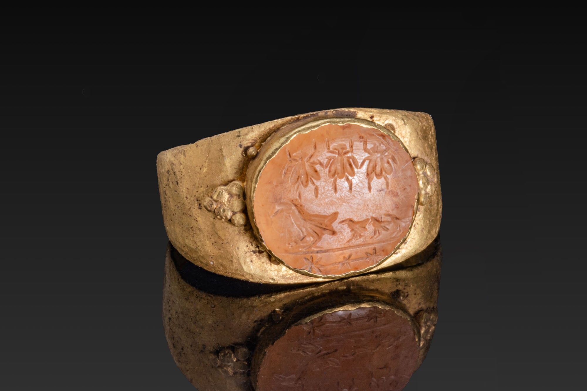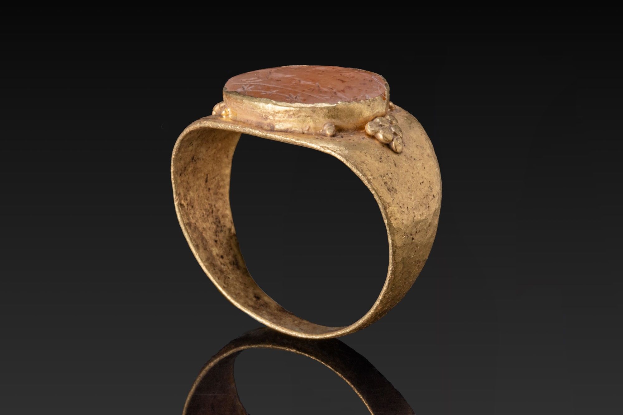 ROMAN PINK CHALCEDONY INTAGLIO DEPICTING A MAGICAL SCENE IN GOLD RING.