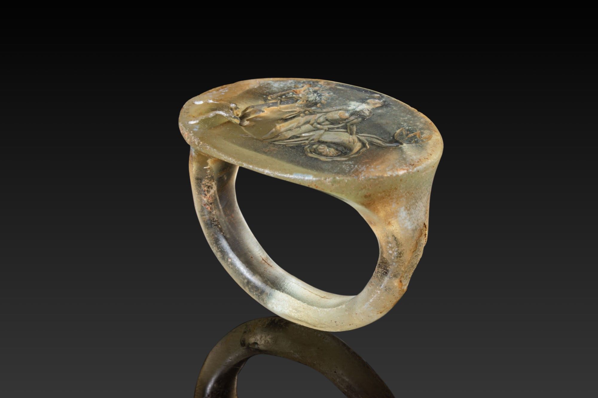STUNNING ROMAN GLASS RING DEPICTING NEREID RIDING SEAHORSE.