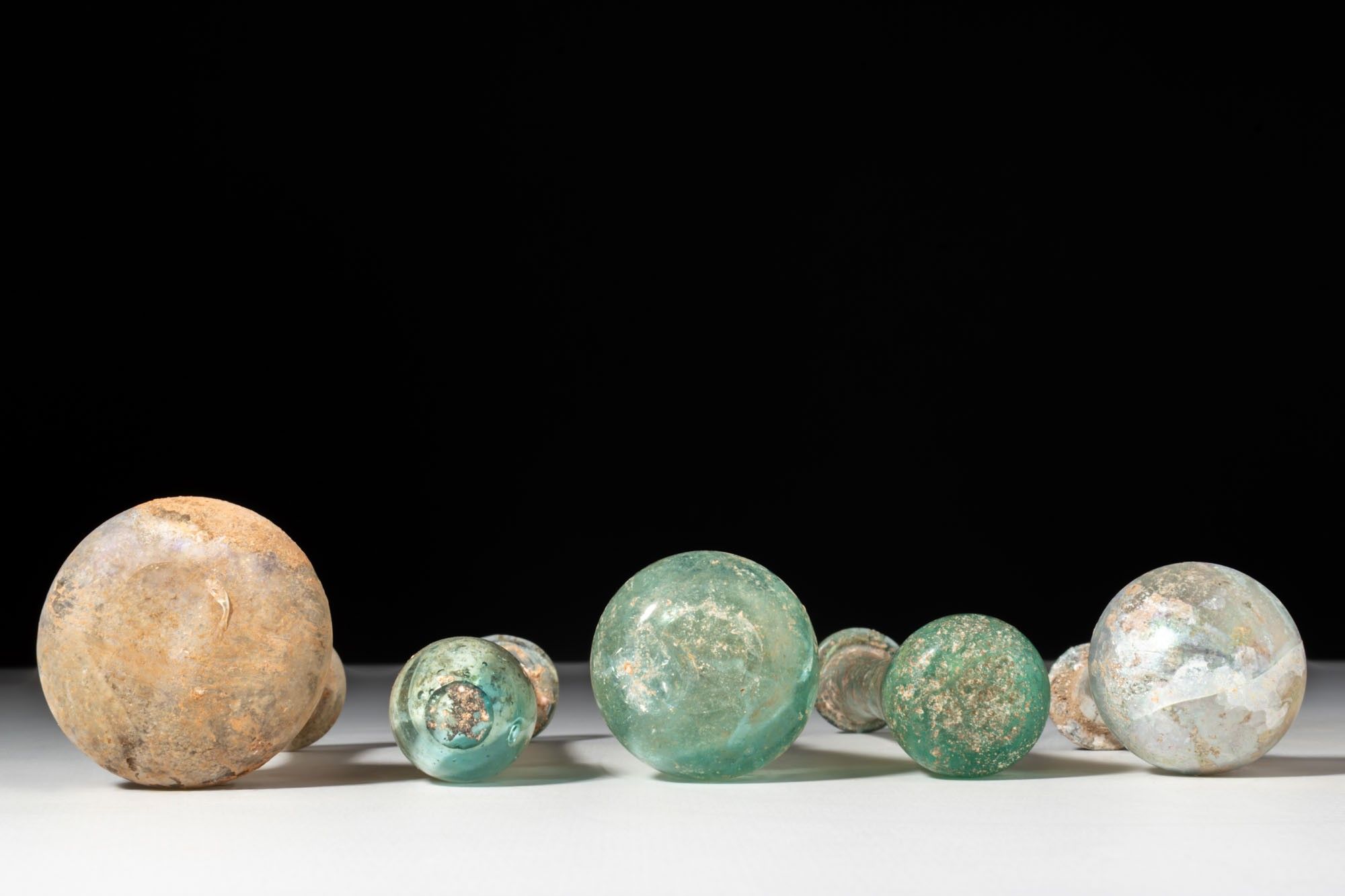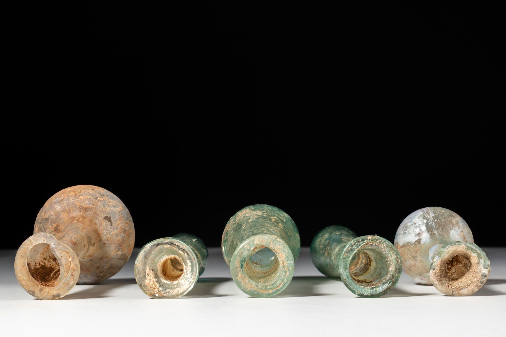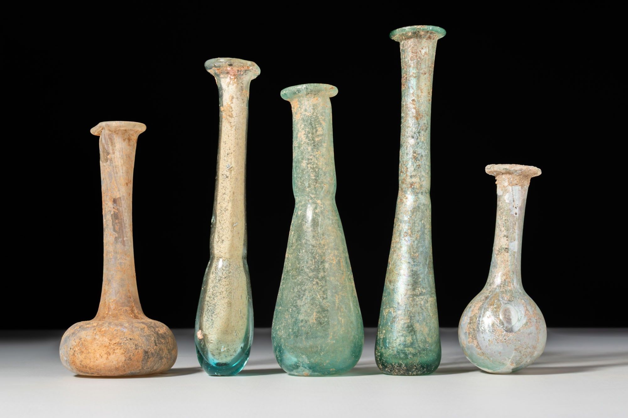 A collection of five glass unguentaria, including, from left to right: a bottle with a compressed globular body, a tall straight neck, and a rounded lip; a slender example with an elongated drop-shaped body rising to a long cylindrical neck capped by a folded rim; a flask with a piriform body, a short collar, and a plain out-turned mouth; a tall vessel with a tapering body, an extended neck with a slight median constriction, and a broad rim; and a bottle with a spherical body, a narrow tubular neck, and a lightly flared mouth.