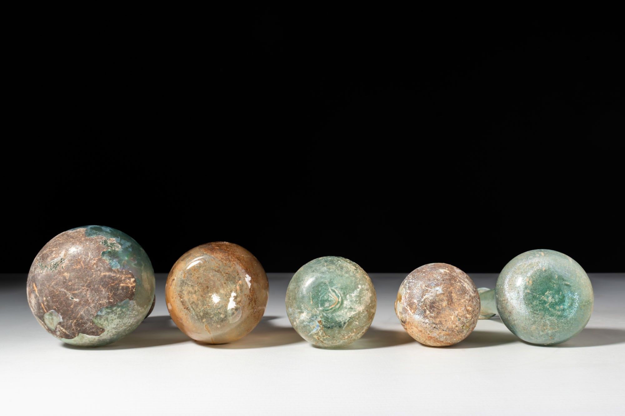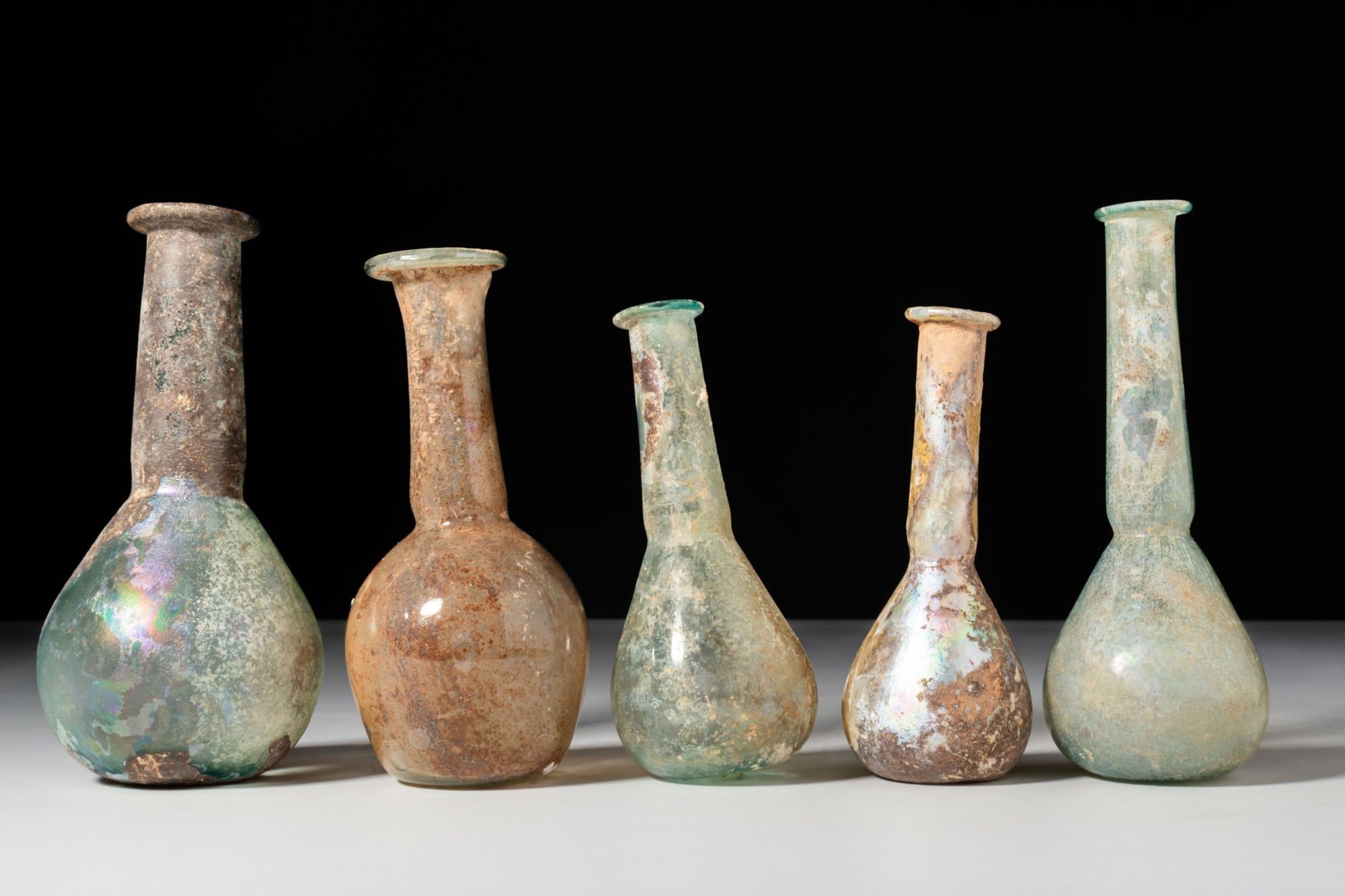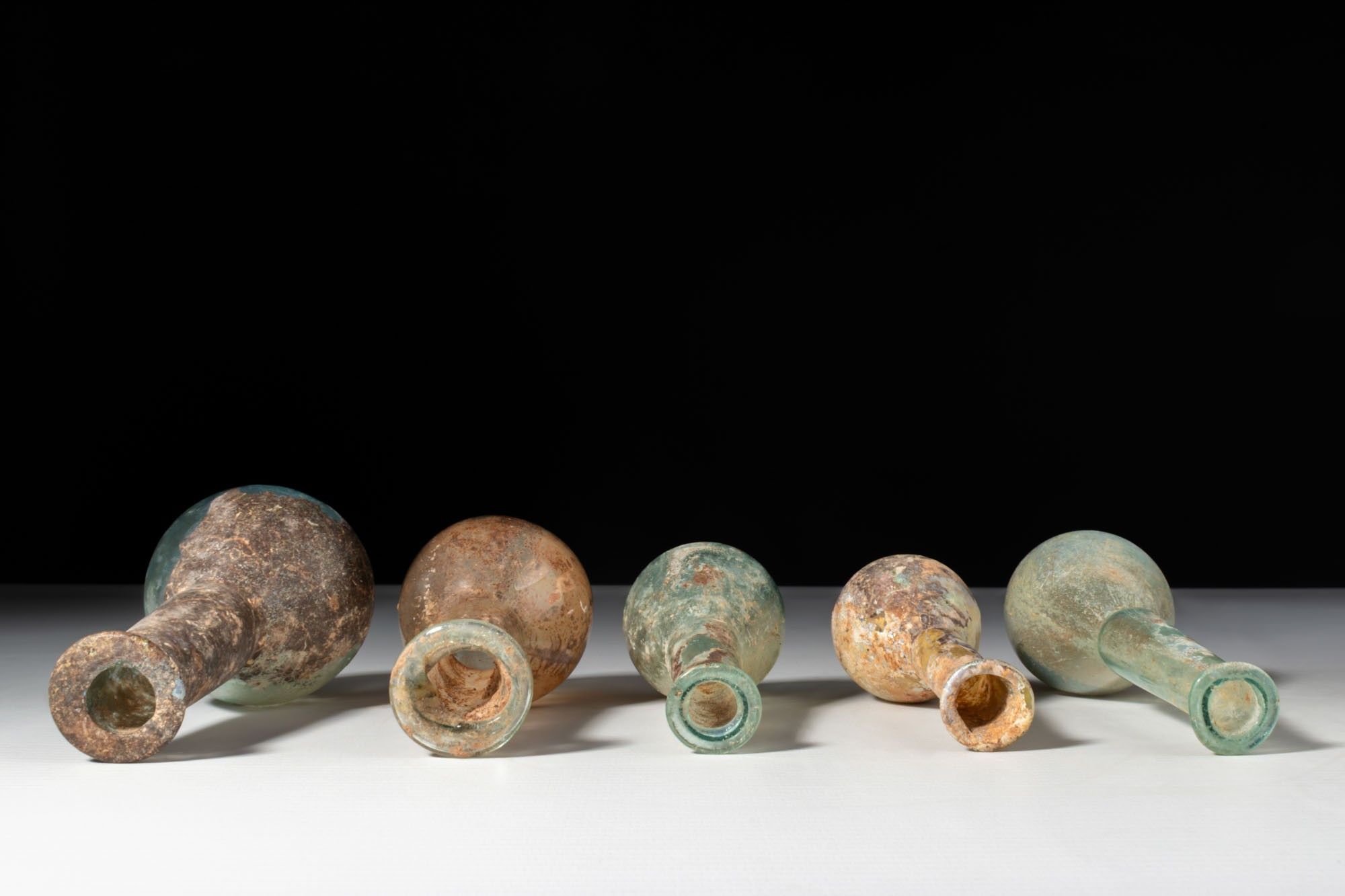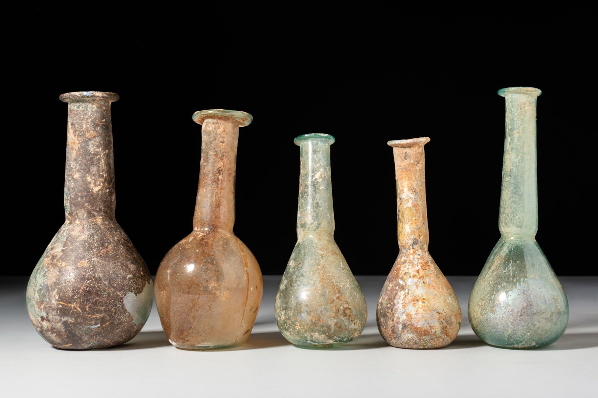 A collection of five glass unguentaria, including, from left to right: a bottle with a piriform body rising to a tall tubular neck finished with a rounded everted rim; a squat example with a near-spherical body, a slightly constricted neck, and an out-turned lip; and three pear-shaped bottles with elongated cylindrical necks and thickened rims.