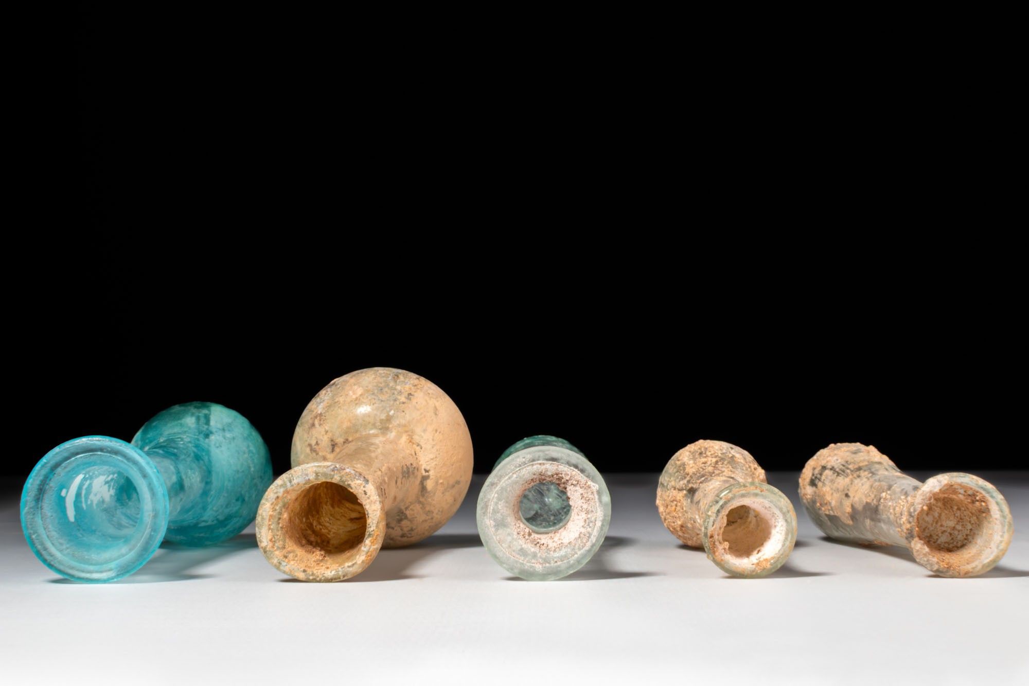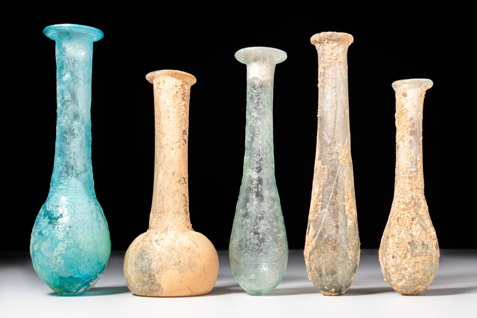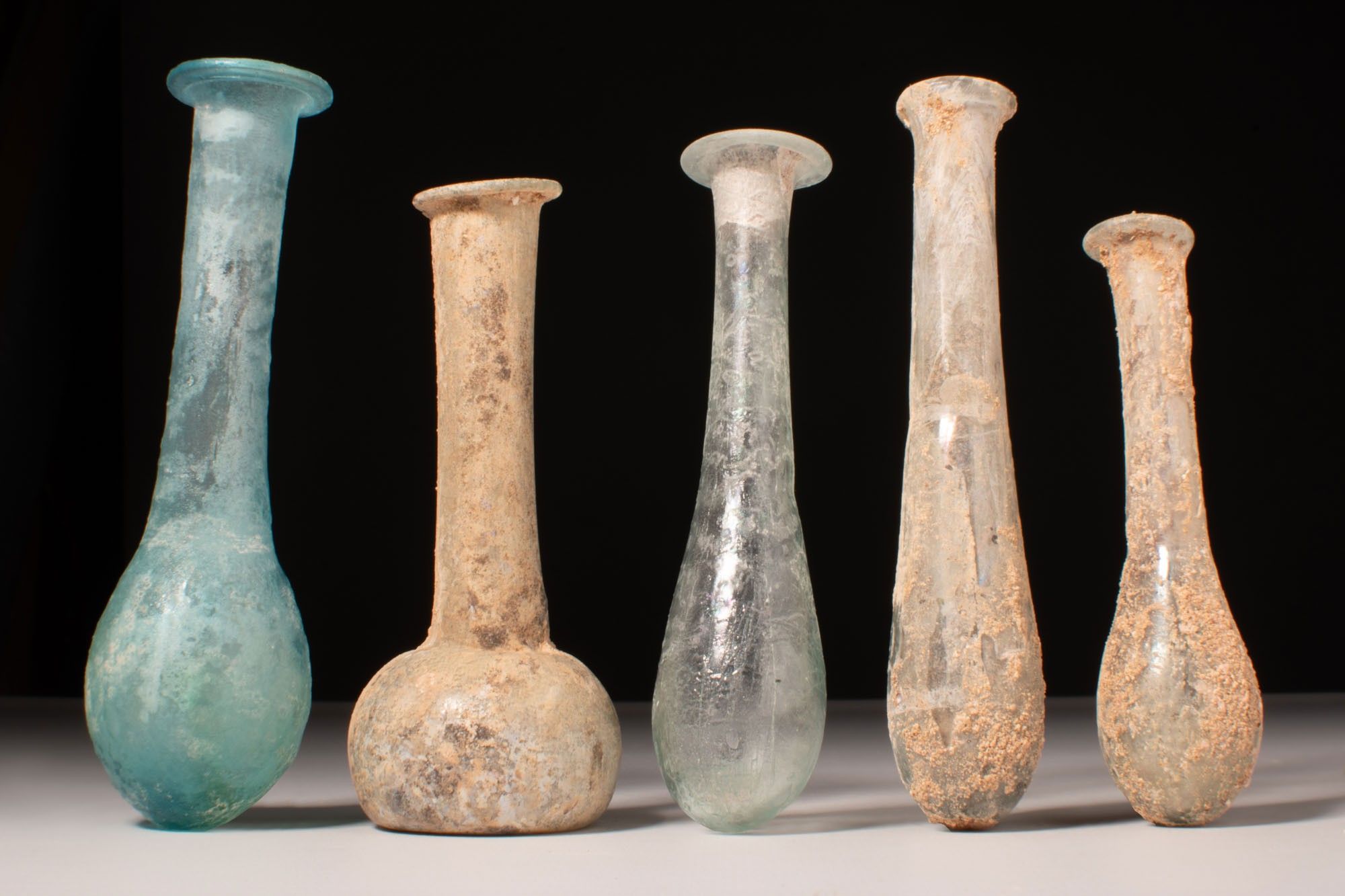 A collection of five glass unguentaria, including, from left to right: a tear-shaped bottle with an ovoid lower body rising to a narrow neck and a broad rim; a candlestick flask with a globular base, a drawn cylindrical neck, and a flat rolled lip; a slender drop-shaped phial with a tapering body, a long neck, and a wide rim; a tall vessel with an elongated body, a long straight neck, and an expanded mouth; and a small piriform bottle with a tubular neck and a folded rim.