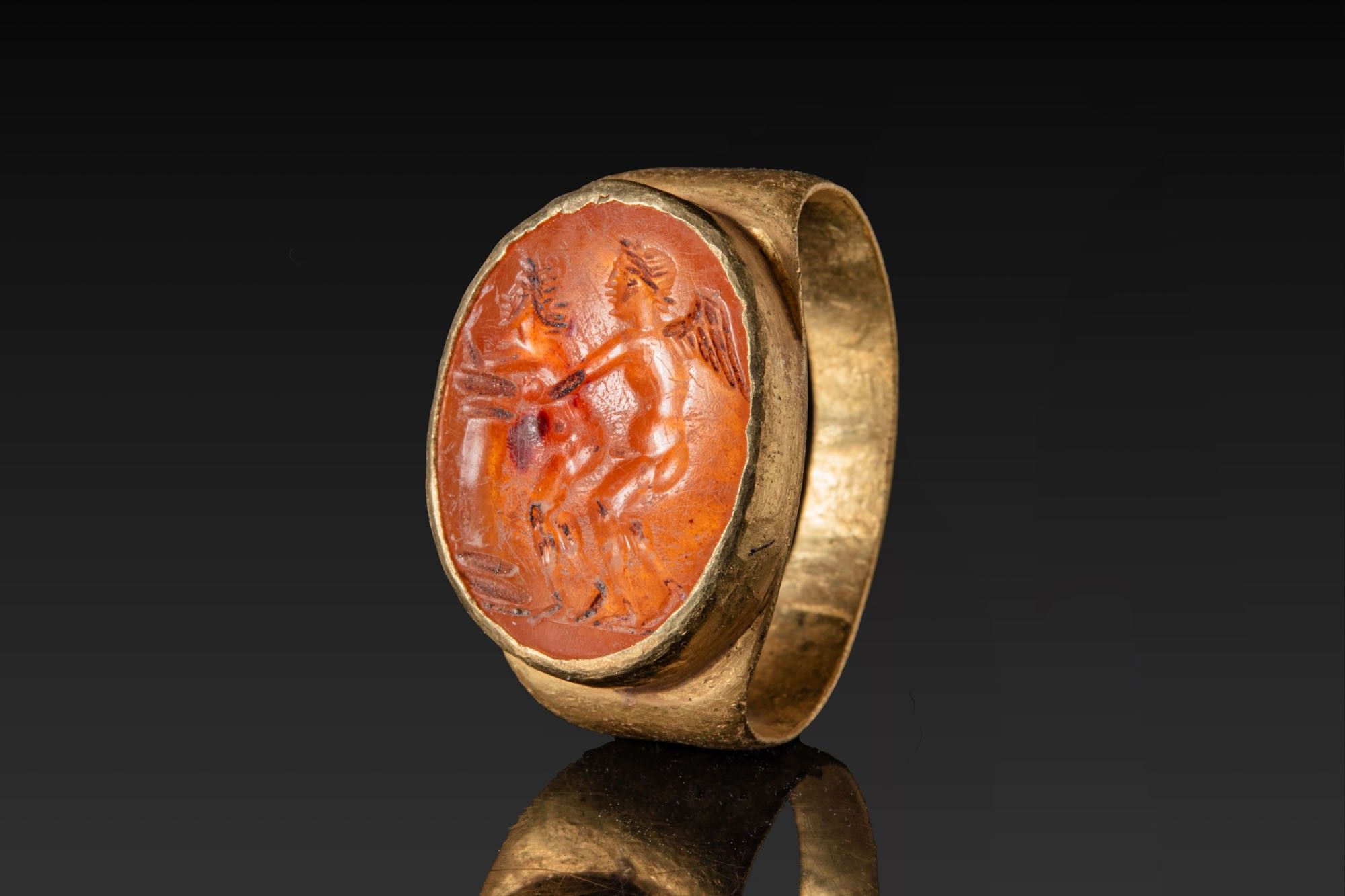 ROMAN CARNELIAN INTAGLIO WITH EROTIC SCENE IN GOLD RING. Ca.…