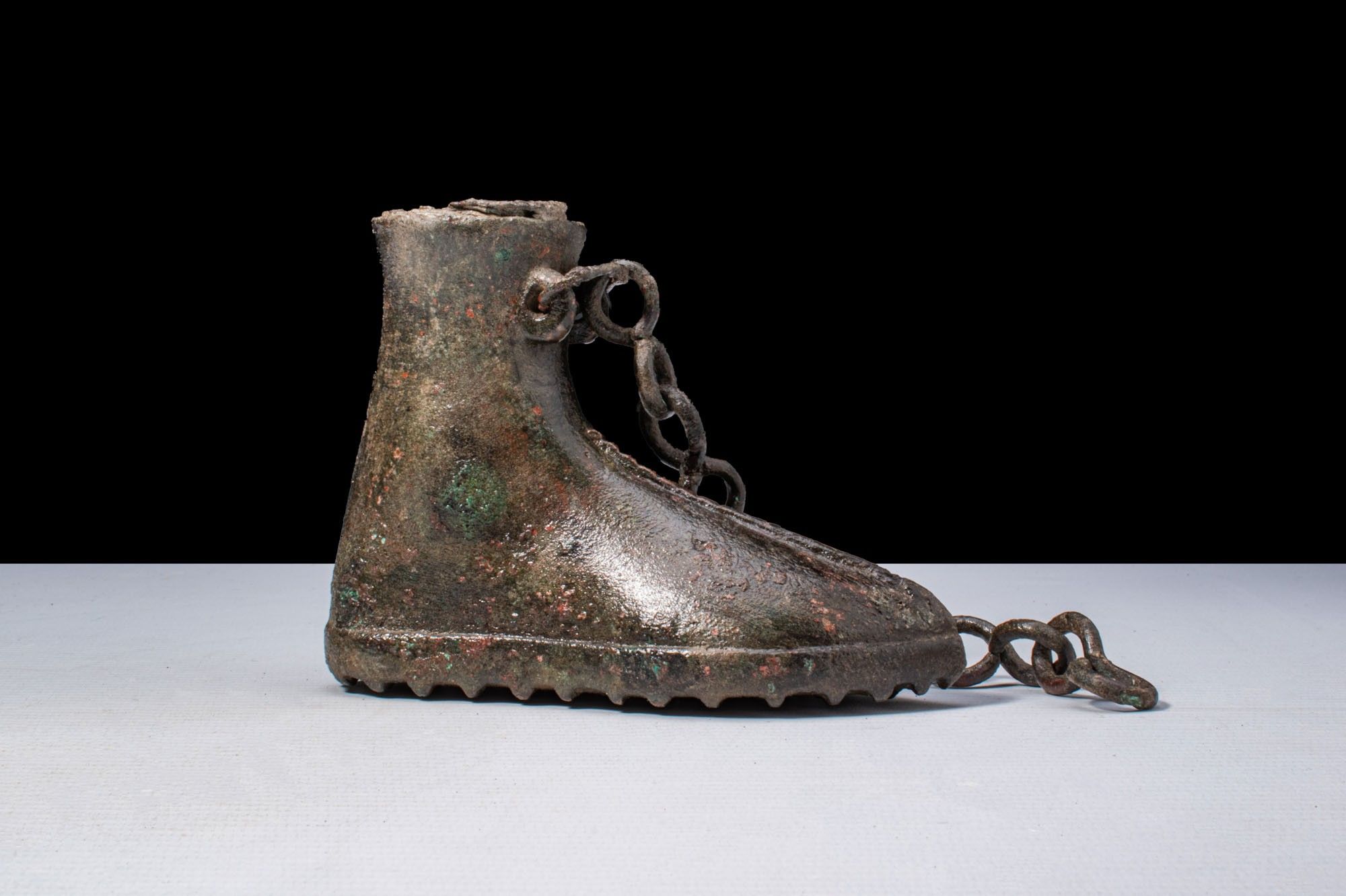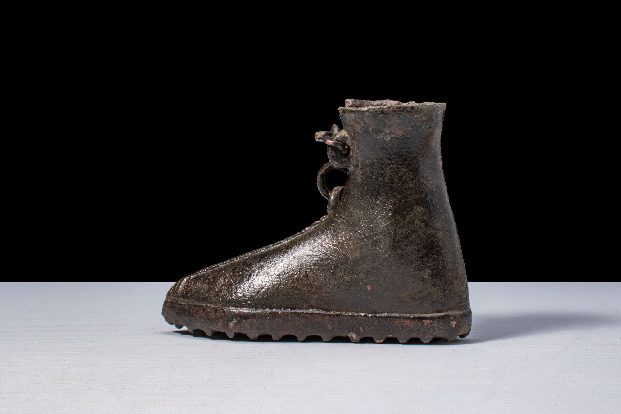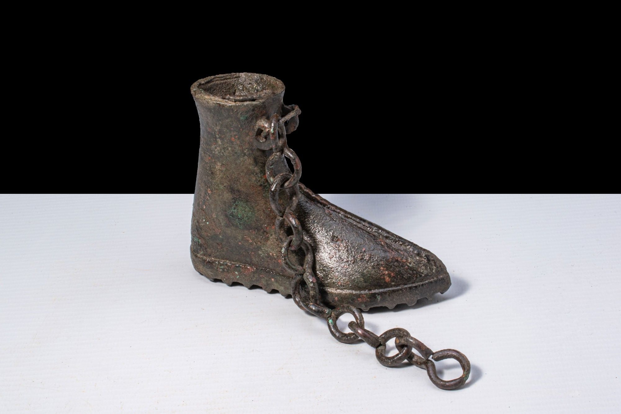 A bronze boot-shaped votive vessel. The body modelled as a high ankle boot with a pointed toe and a pronounced central seam. Integral loop attachments secure a chain, and the sole is fitted with square hobnails.