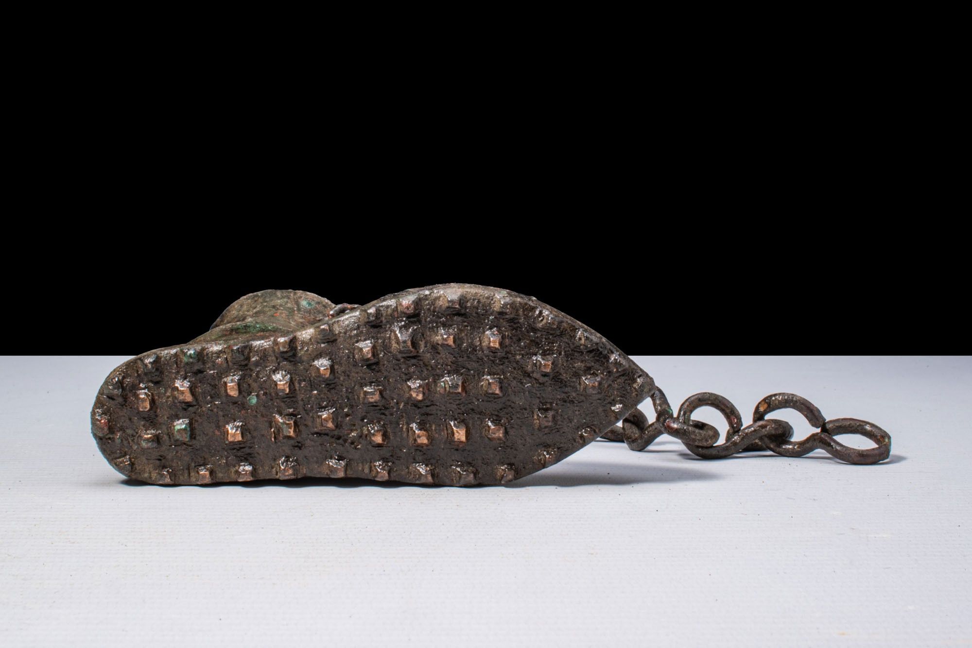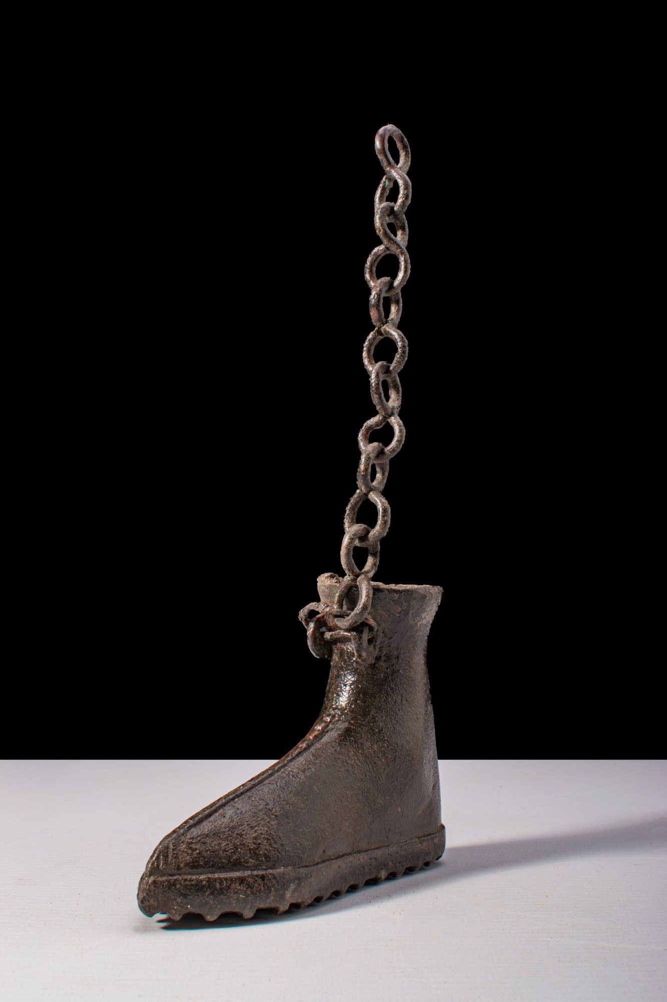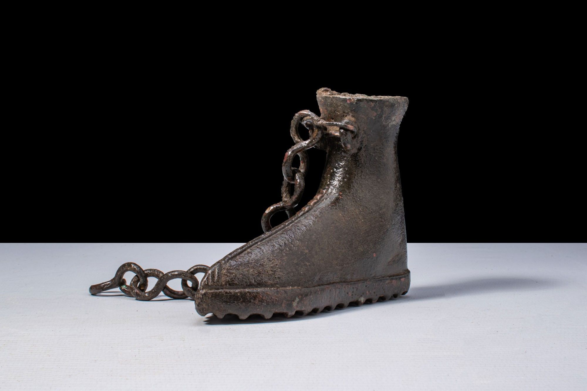 A bronze boot-shaped votive vessel. The body modelled as a high ankle boot with a pointed toe and a pronounced central seam. Integral loop attachments secure a chain, and the sole is fitted with square hobnails.