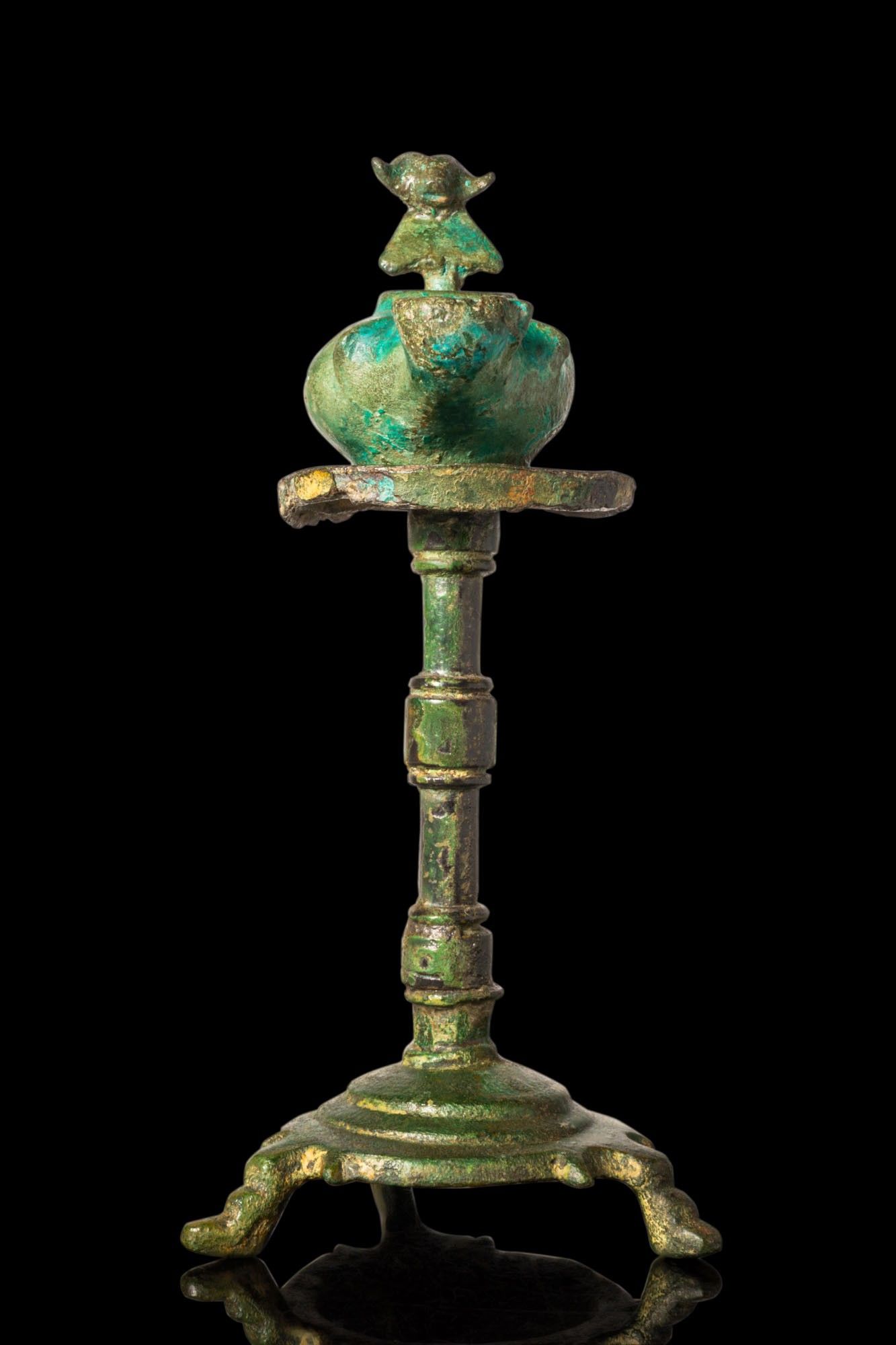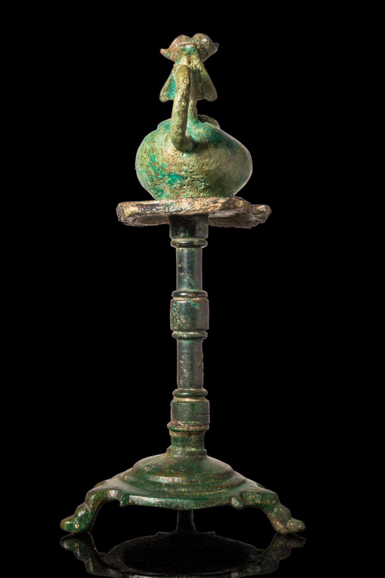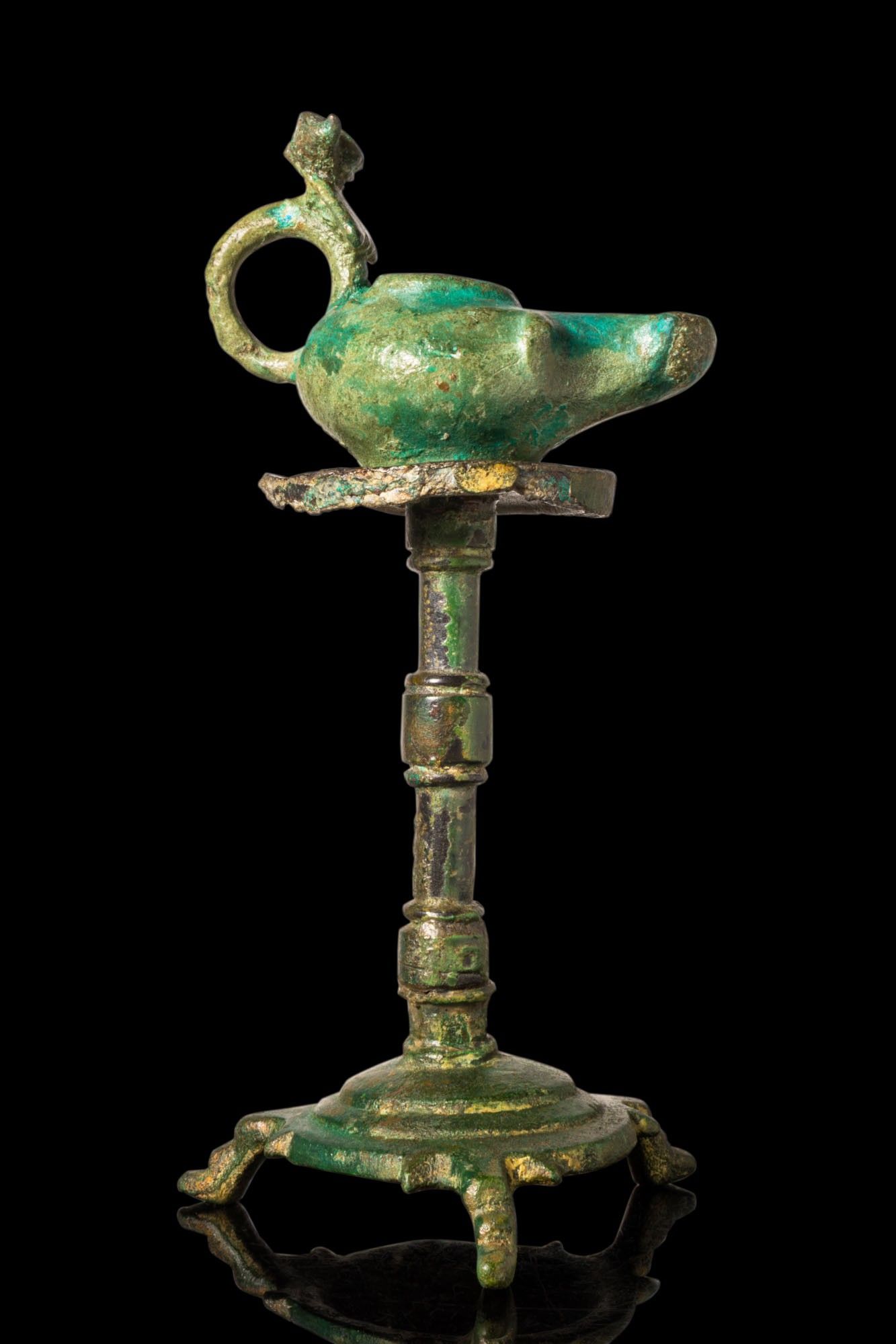 Premium ROMAN BRONZE OIL LAMP WITH RAM’S HEAD HANDLE ON STAND. Ca. A…