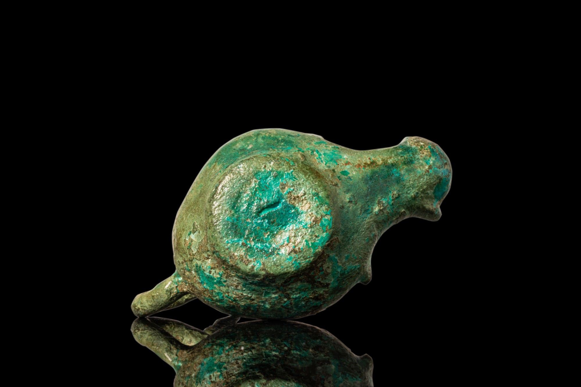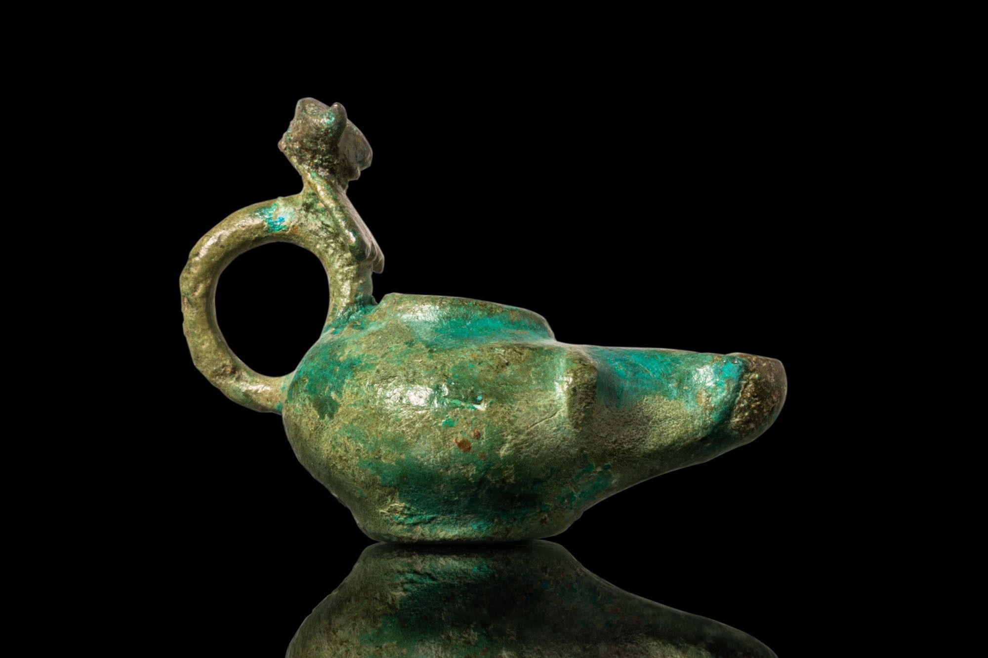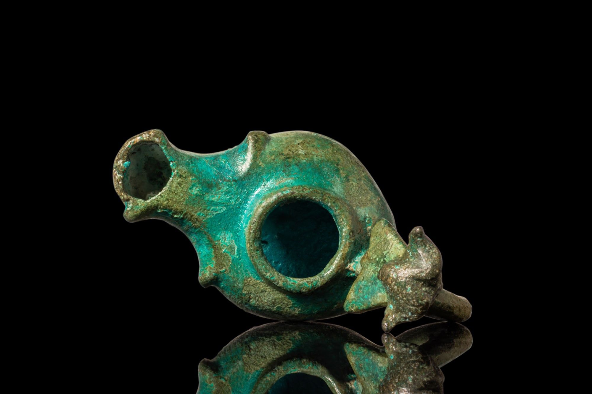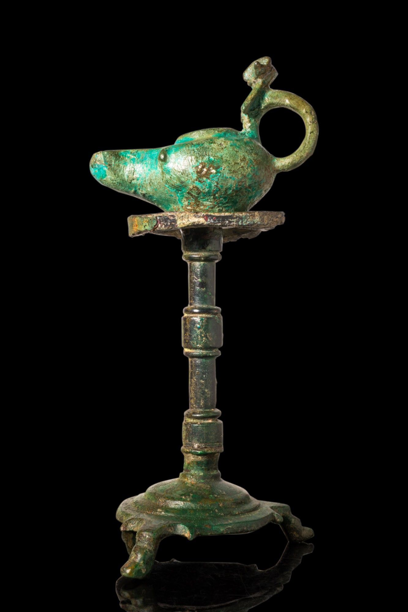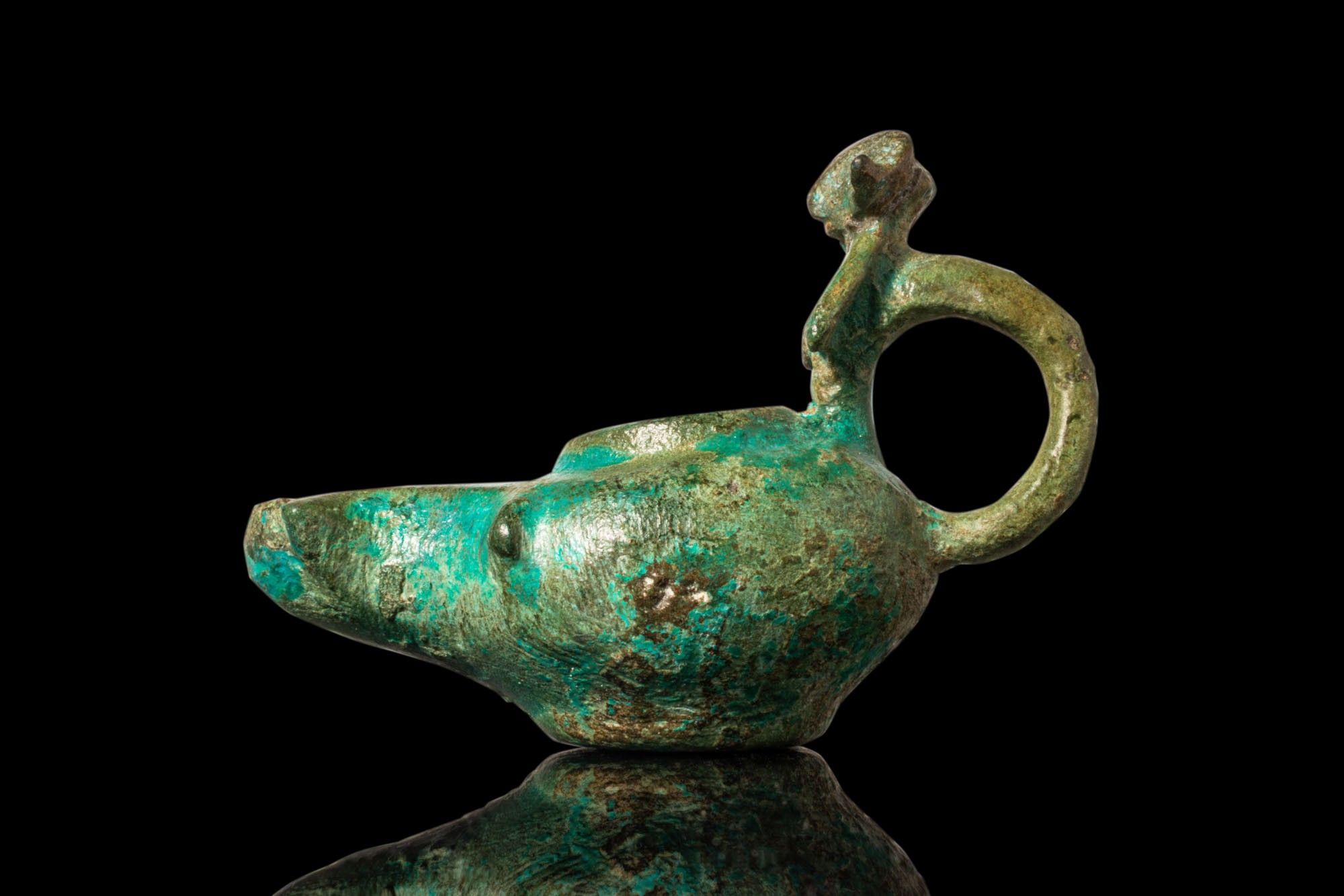 ROMAN BRONZE OIL LAMP WITH RAM’S HEAD HANDLE ON STAND.