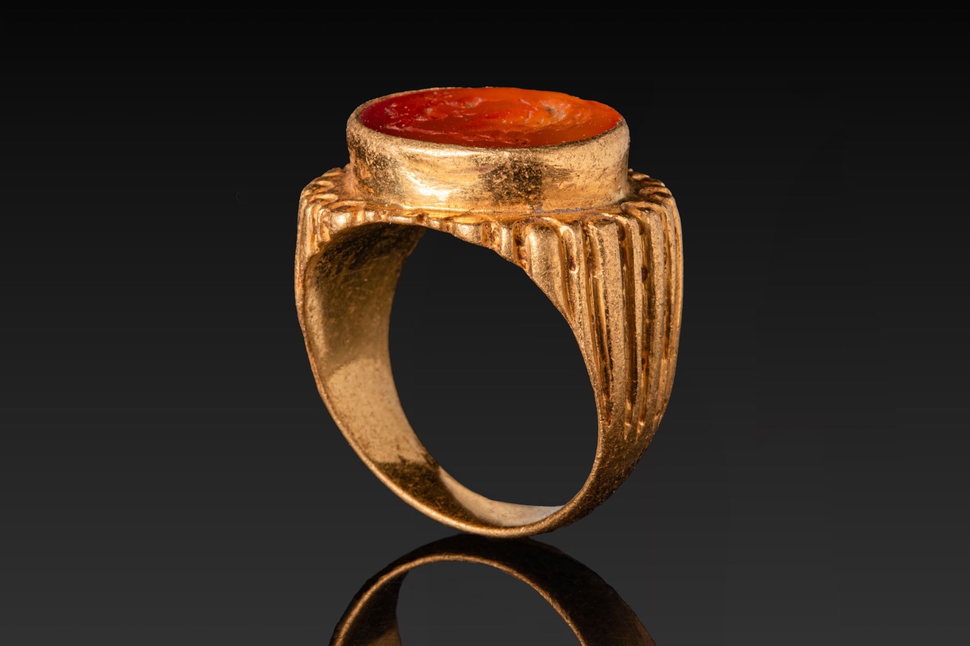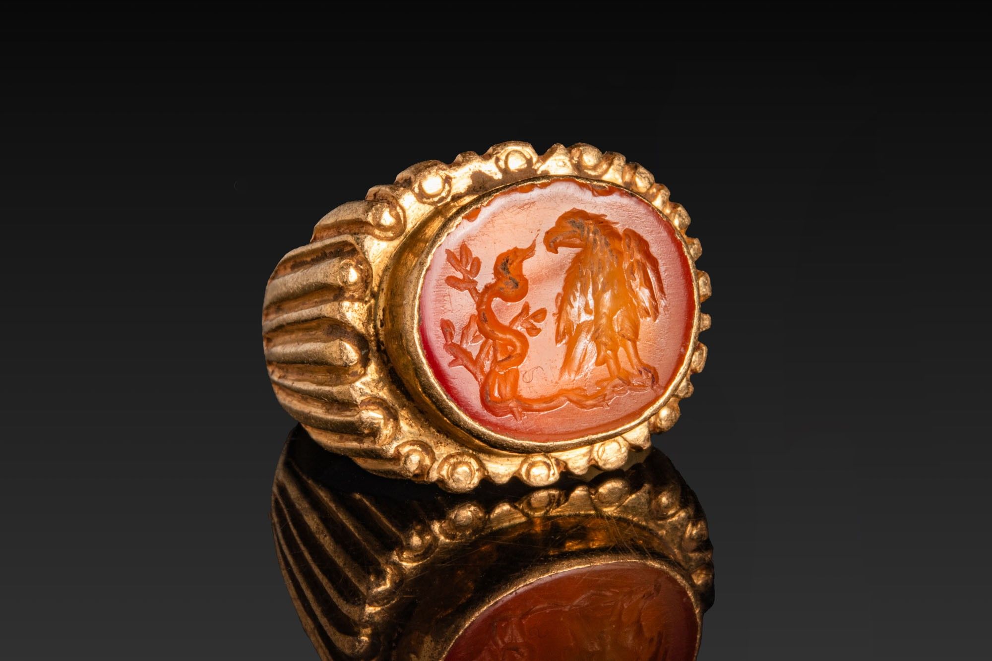 A carnelian intaglio engraved with a legionary eagle standing right, head lowered and wings partly spread, confronting a rearing serpent entwined about a stem. A gold ring mounts the gem in a high oval collet, the broad shoulders worked with vertical flutes. The ring of a possibly later period.