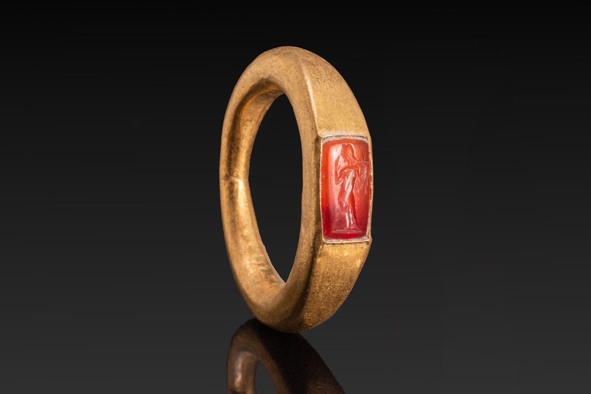 Premium ROMAN CARNELIAN INTAGLIO DEPICTING FORTUNA IN GOLD RING. Ca.…