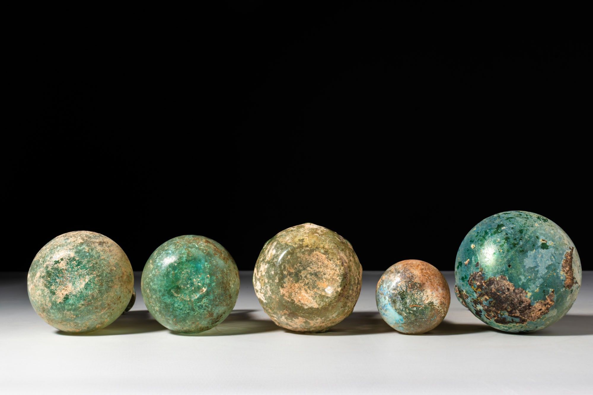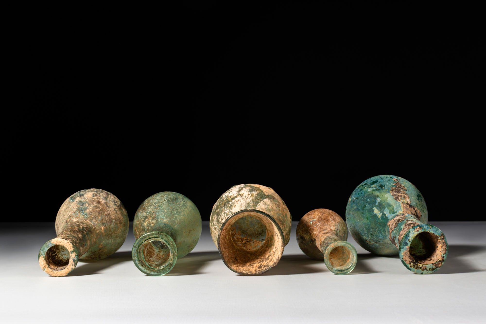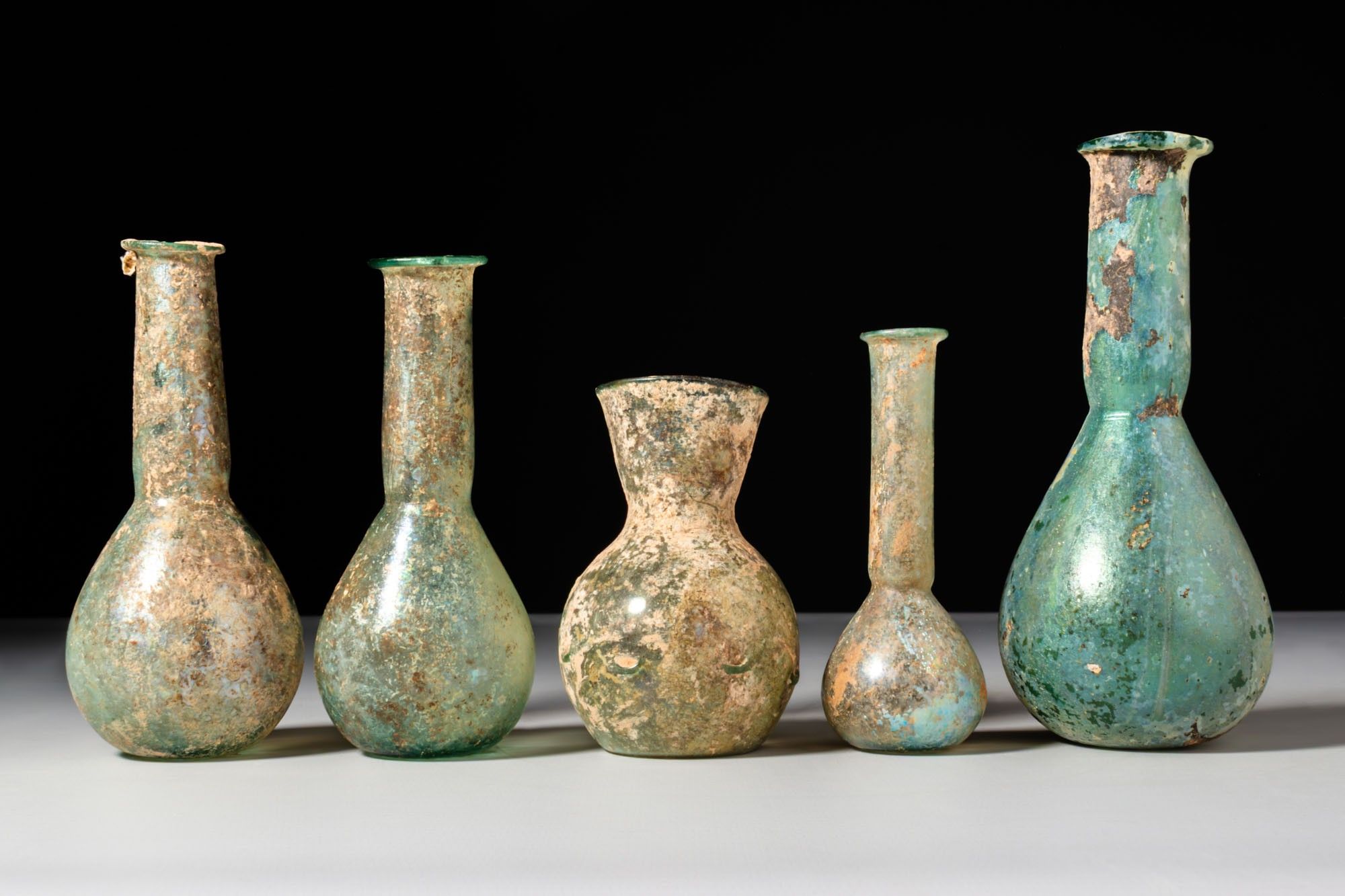 A collection of five glass unguentaria, including, from left to right: two green glass vessels with a pear-shaped body rising to a long cylindrical neck and a rounded rim; a squat jar with a rounded body, a short concave neck, and a wide funnel mouth with a plain lip; a bottle with a piriform body, a slender tubular neck, and an out-turned lip; and a large vessel with an elongated pear-shaped body, a tall cylindrical neck, and a folded rim.