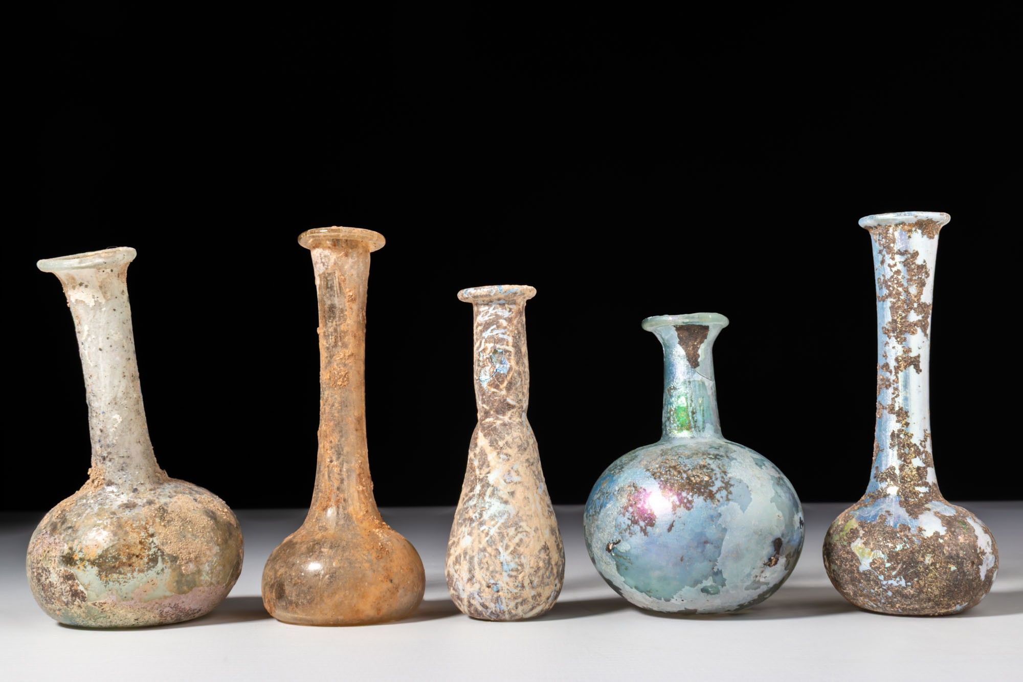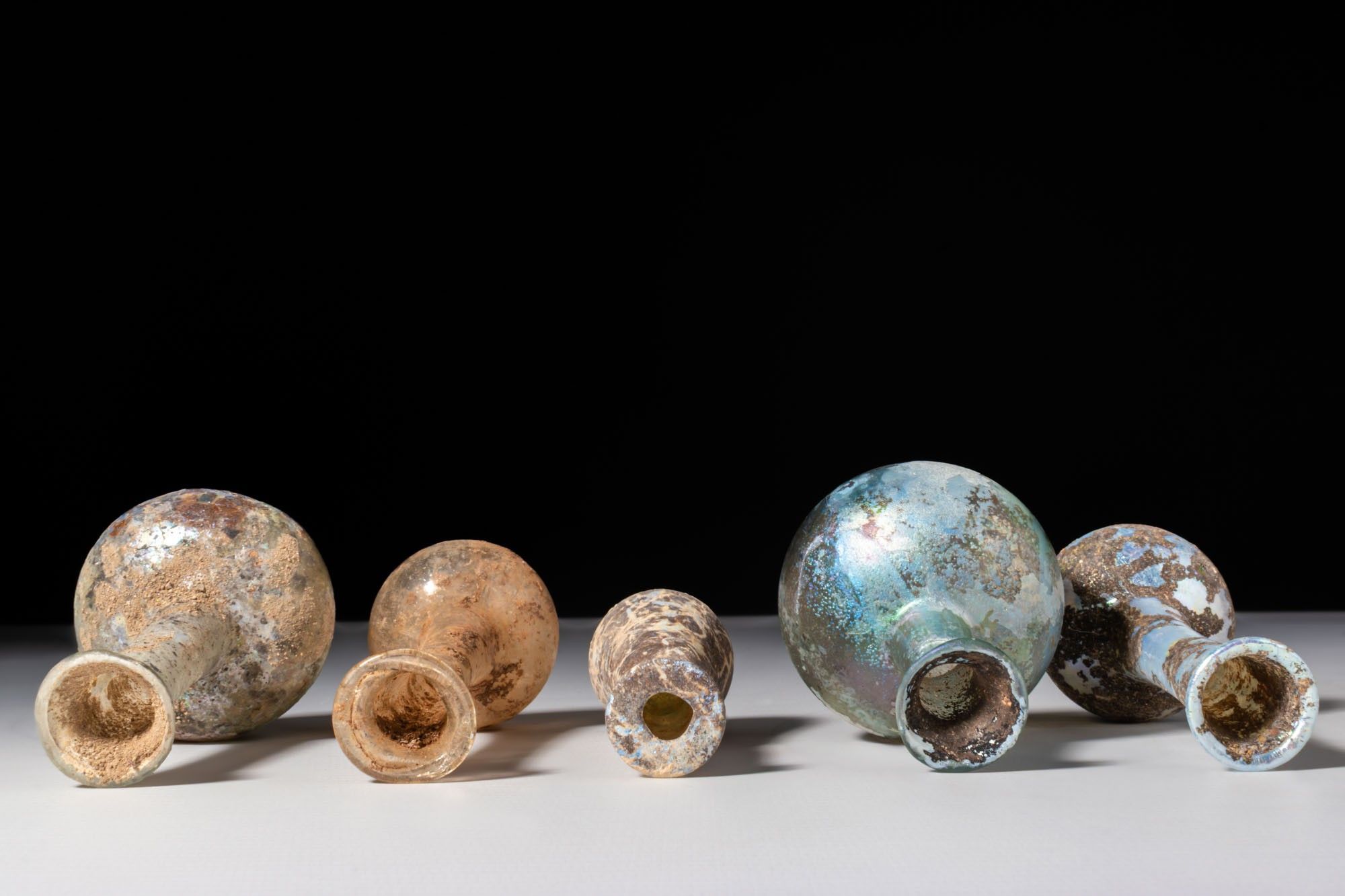 A collection of five glass unguentaria, including, from left to right: a bottle with a broad globular body, a tall cylindrical neck, and a rolled rim; a candlestick flask with a rounded bulb base rising into a slender neck finished with a folded rim; a piriform bottle with a constricted neck and a small rounded lip; a squat jar with a spherical body, a tubular neck, and a wide funnel mouth; and a second candlestick type with a globular lower body, an elongated straight neck, and a flared mouth.