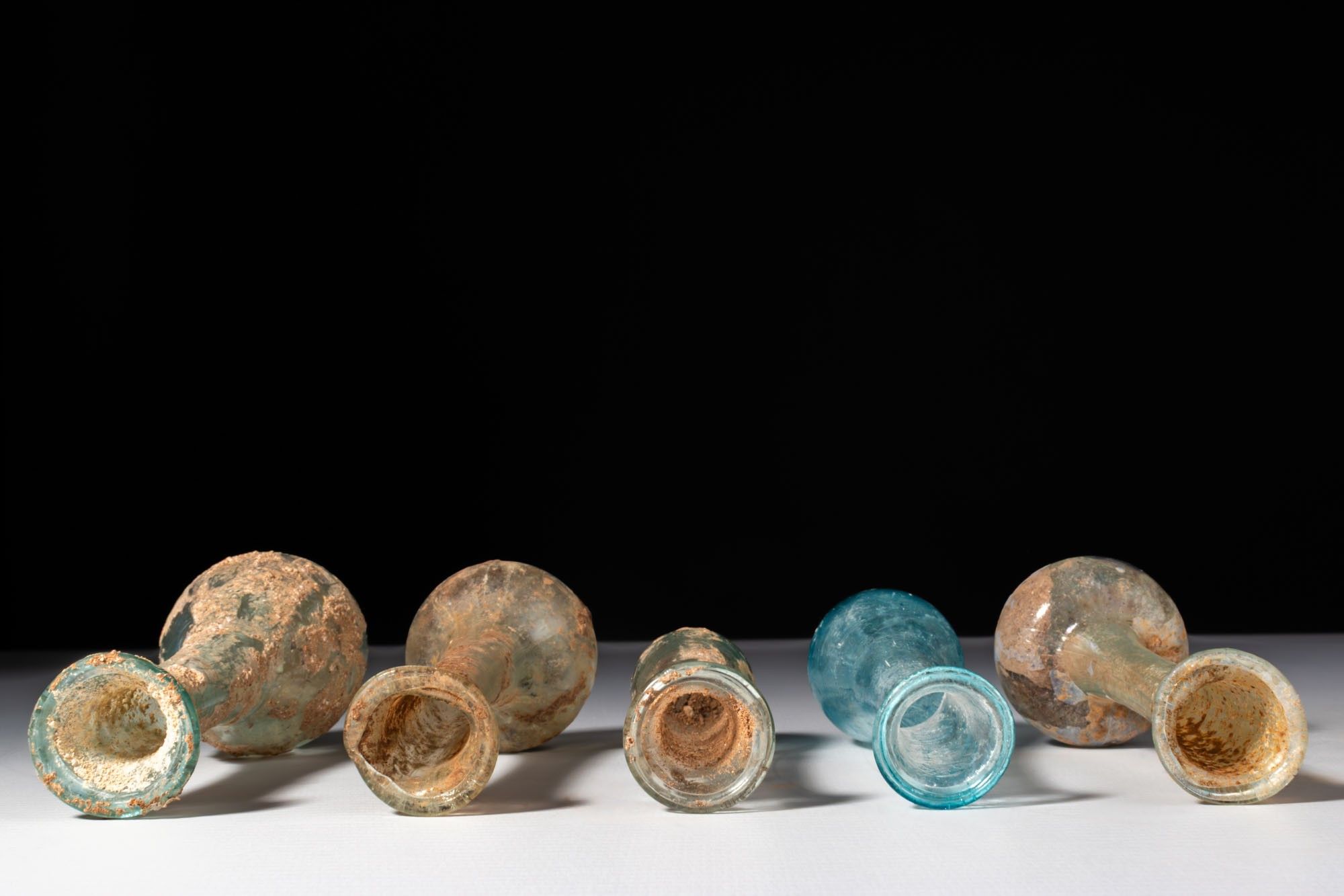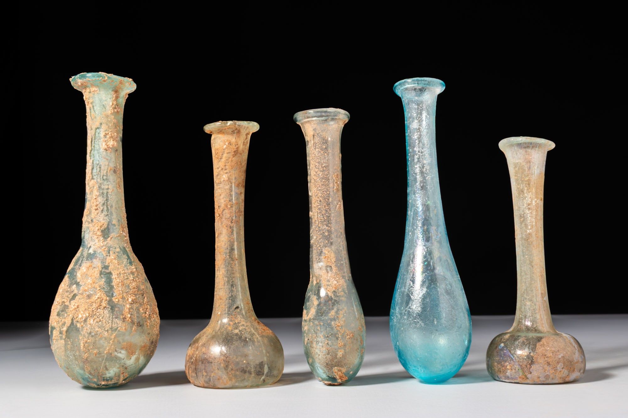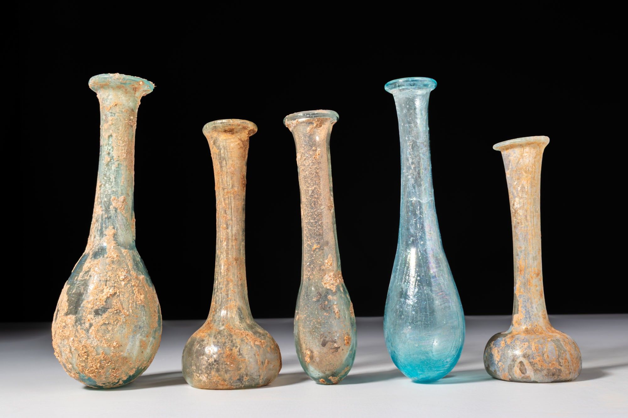 A collection of five glass unguentaria, including, from left to right: a bottle with a drop-shaped body, a tall tubular neck, and a lightly everted mouth; a candlestick flask with a small globular base rising into a long neck finished with a rolled rim; an example with a slender drop-shaped body and a rounded lip; a piriform vessel in bright aqua glass with an elongated neck and a broad rim; and a second candlestick type with a low discoid base, a long straight neck, and an out-turned mouth.