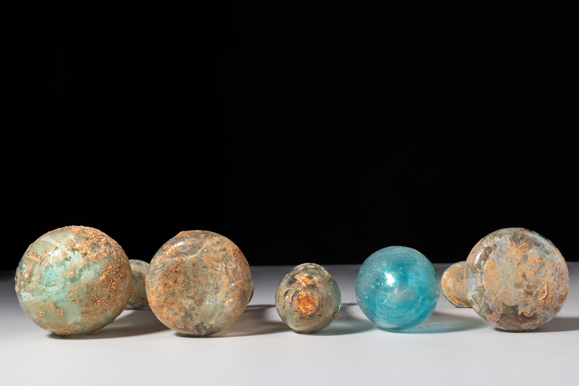 COLLECTION OF ROMAN GLASS UNGUENTARIA. Ca. AD 1 - 200. A col…