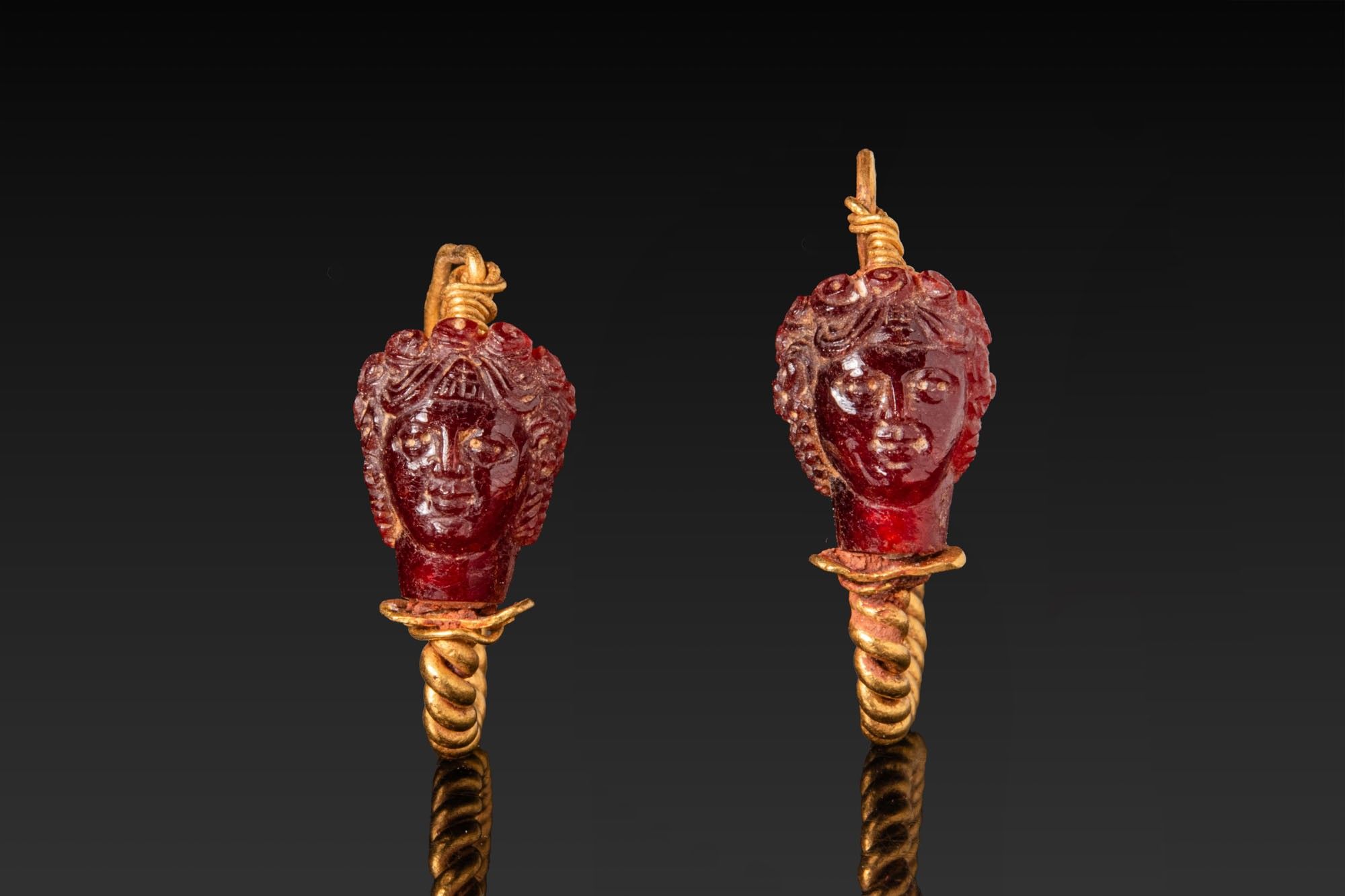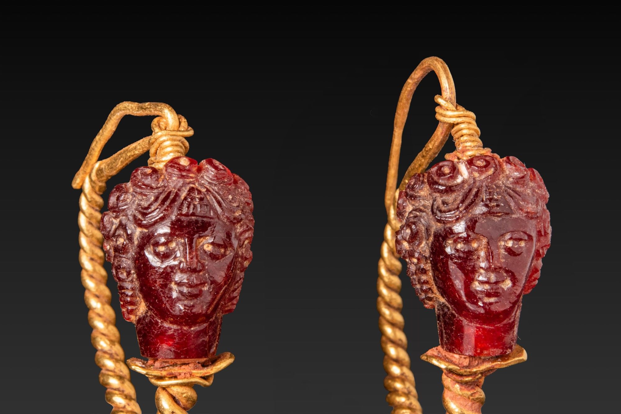 MATCHED PAIR OF ROMAN GOLD AND RED GARNETS EARRINGS WITH CUPID HEADS.