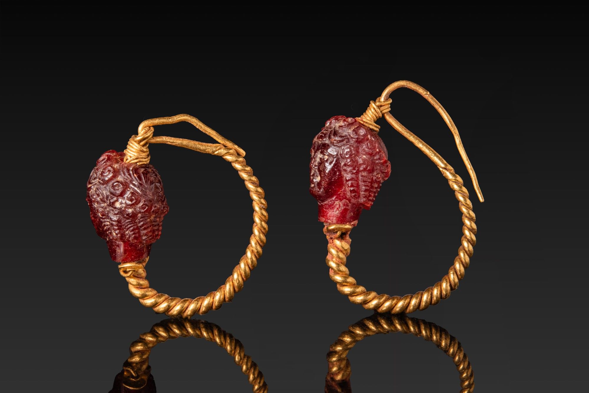 Premium MATCHED PAIR OF ROMAN GOLD AND RED GARNETS EARRINGS WITH CUP…