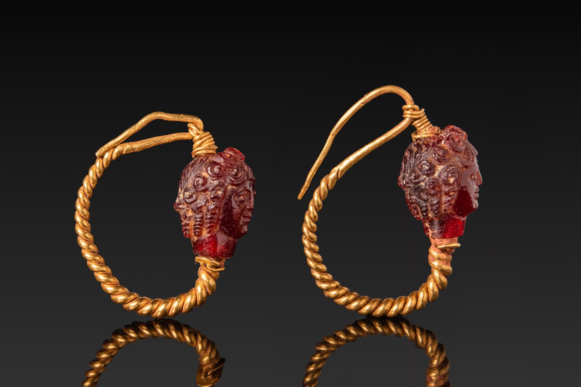 A matched pair of gold earrings, each with a circular hoop of twisted gold wire; one end drawn to a plain tapered point forming the tongue, the other terminating in a narrow gold collar that serves as the base for a red garnet head pendant. The head has a youthful face of Cupid with rounded cheeks and a small mouth, framed by dense spiral curls, and a short neck set into the collar. From the crown projects a gold wire loop through which the tapered end of the hoop passes to fasten.