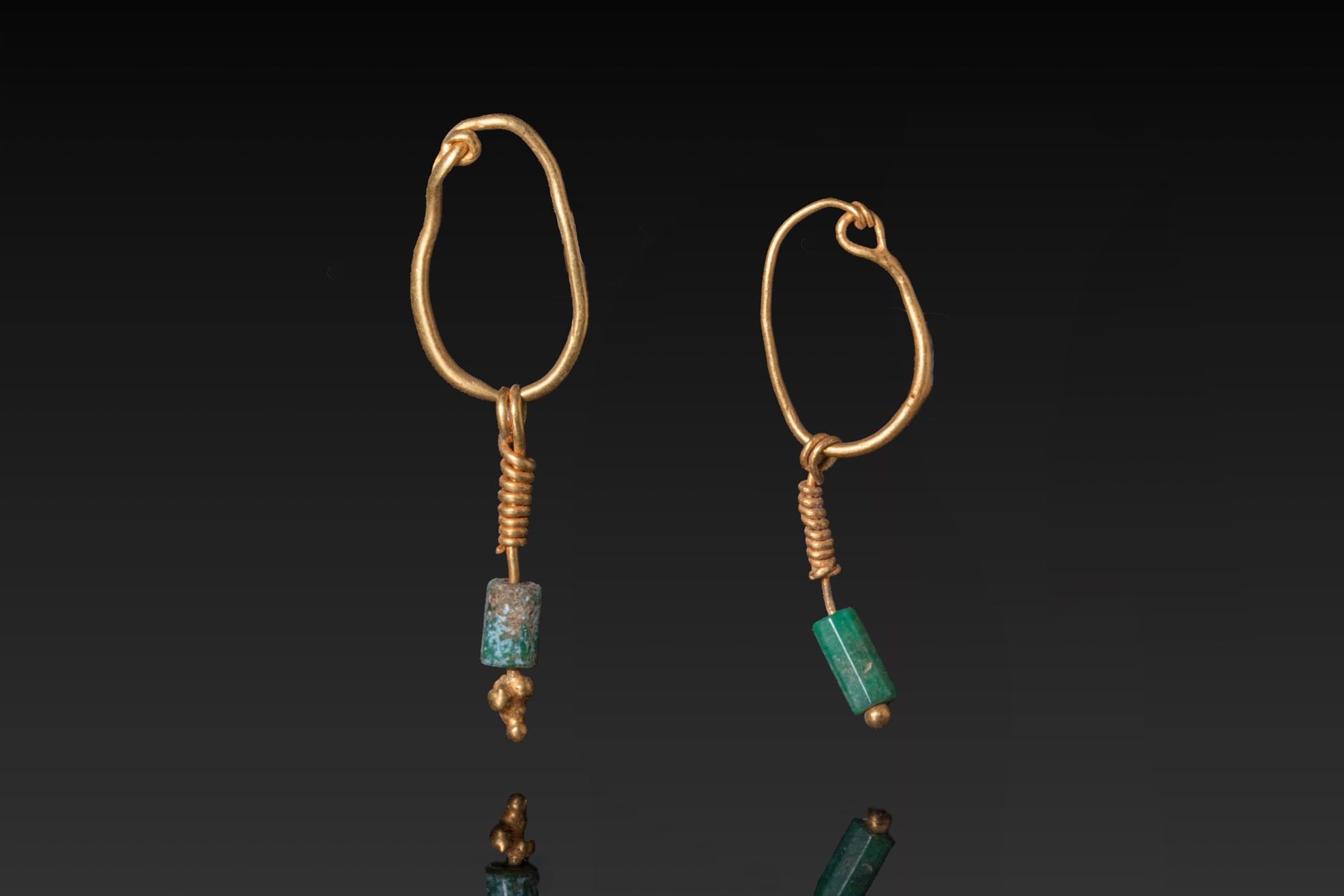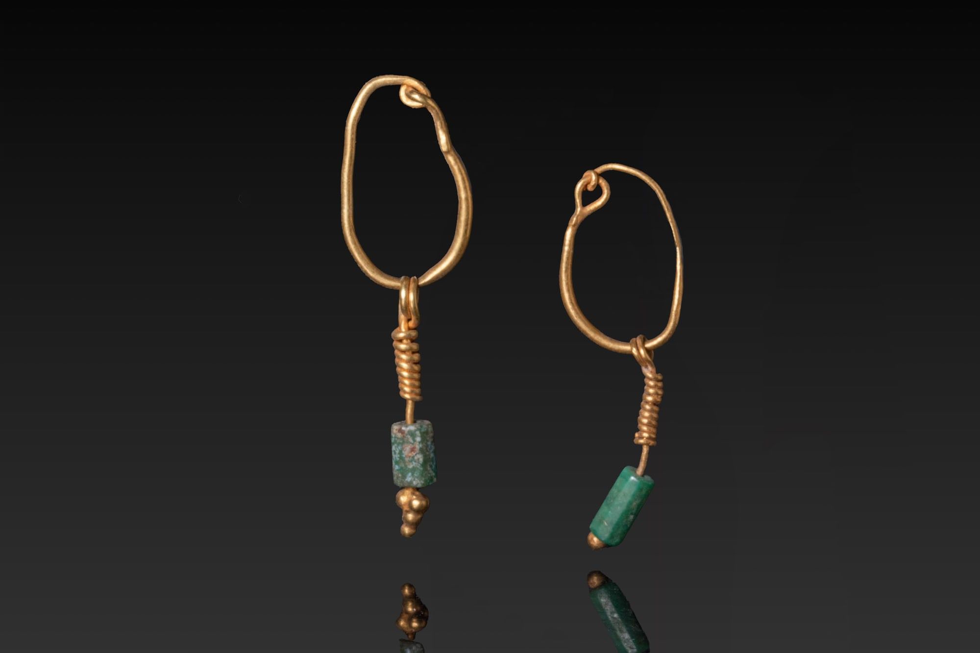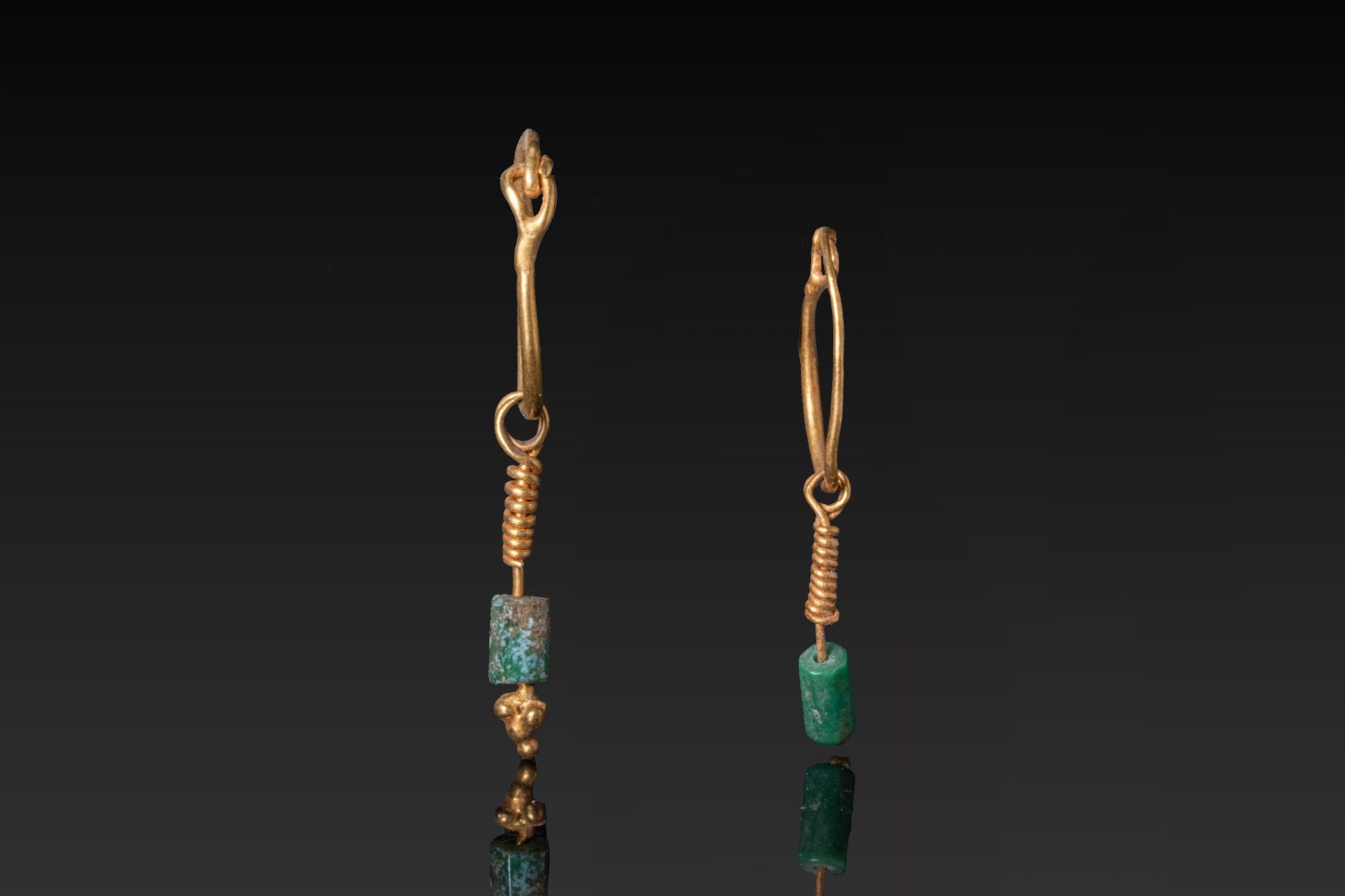Premium PAIR OF ROMAN GOLD AND EMERALD EARRINGS WITH PENDANTS. Ca. A…