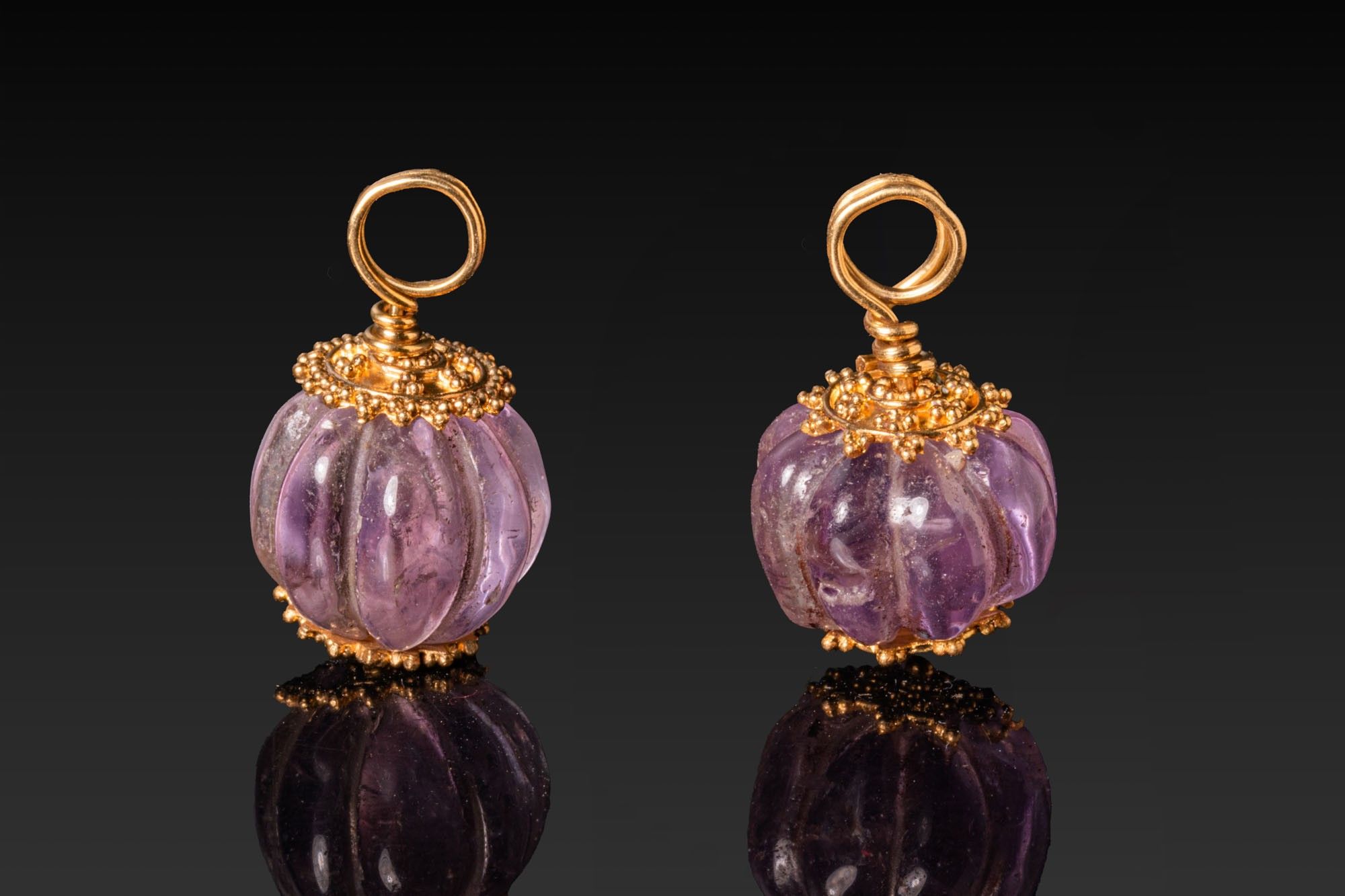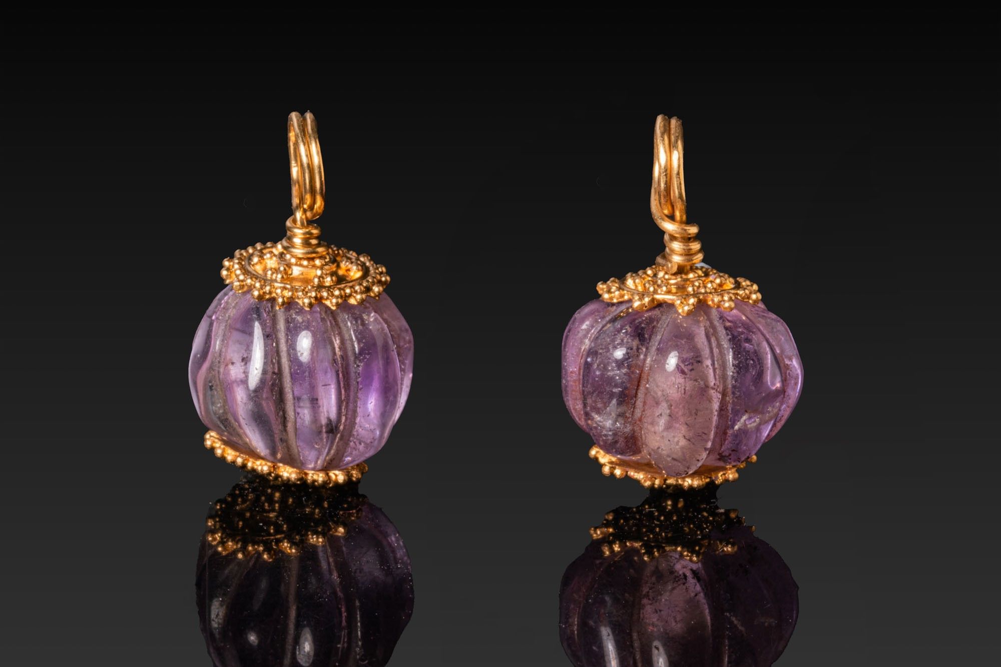 A matched pair of earrings, each with a carved amethyst melon bead cut with deep longitudinal flutes and mounted axially between two gold caps of a possibly later period. Each cap is a domed filigree disc with an outer corona of granules. The upper cap features a tightly coiled suspension ring.