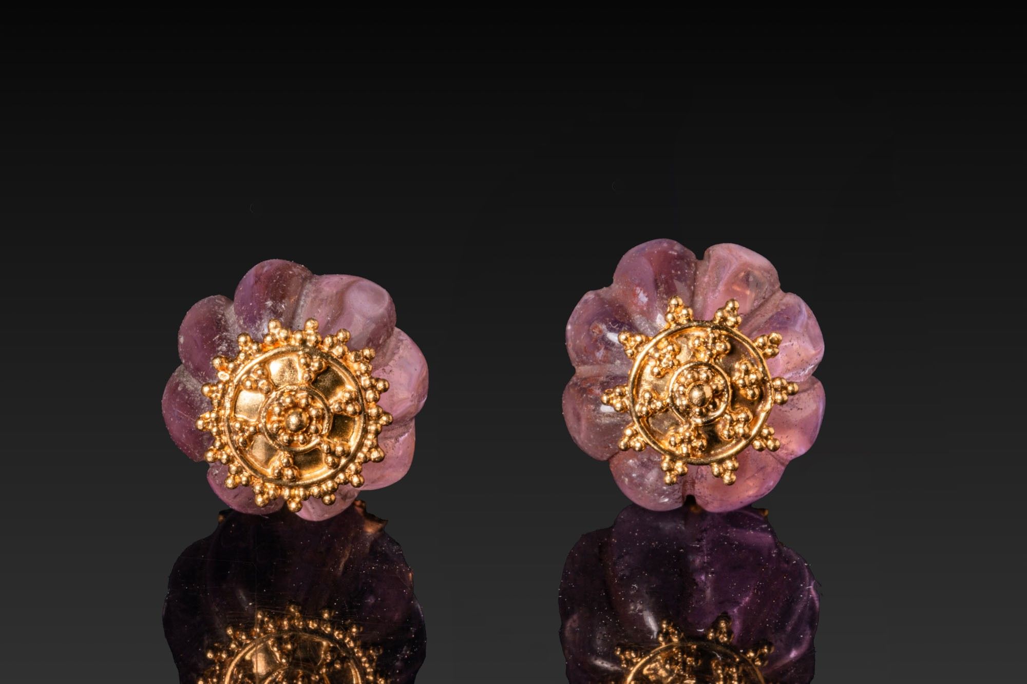 MATCHED PAIR OF GRAECO-ROMAN AMETHYST AND GOLD MELON-SHAPED …