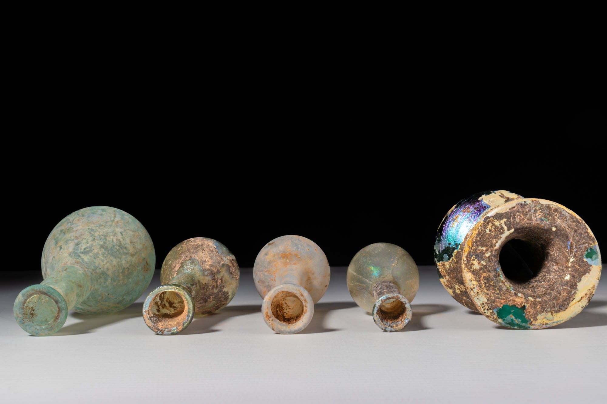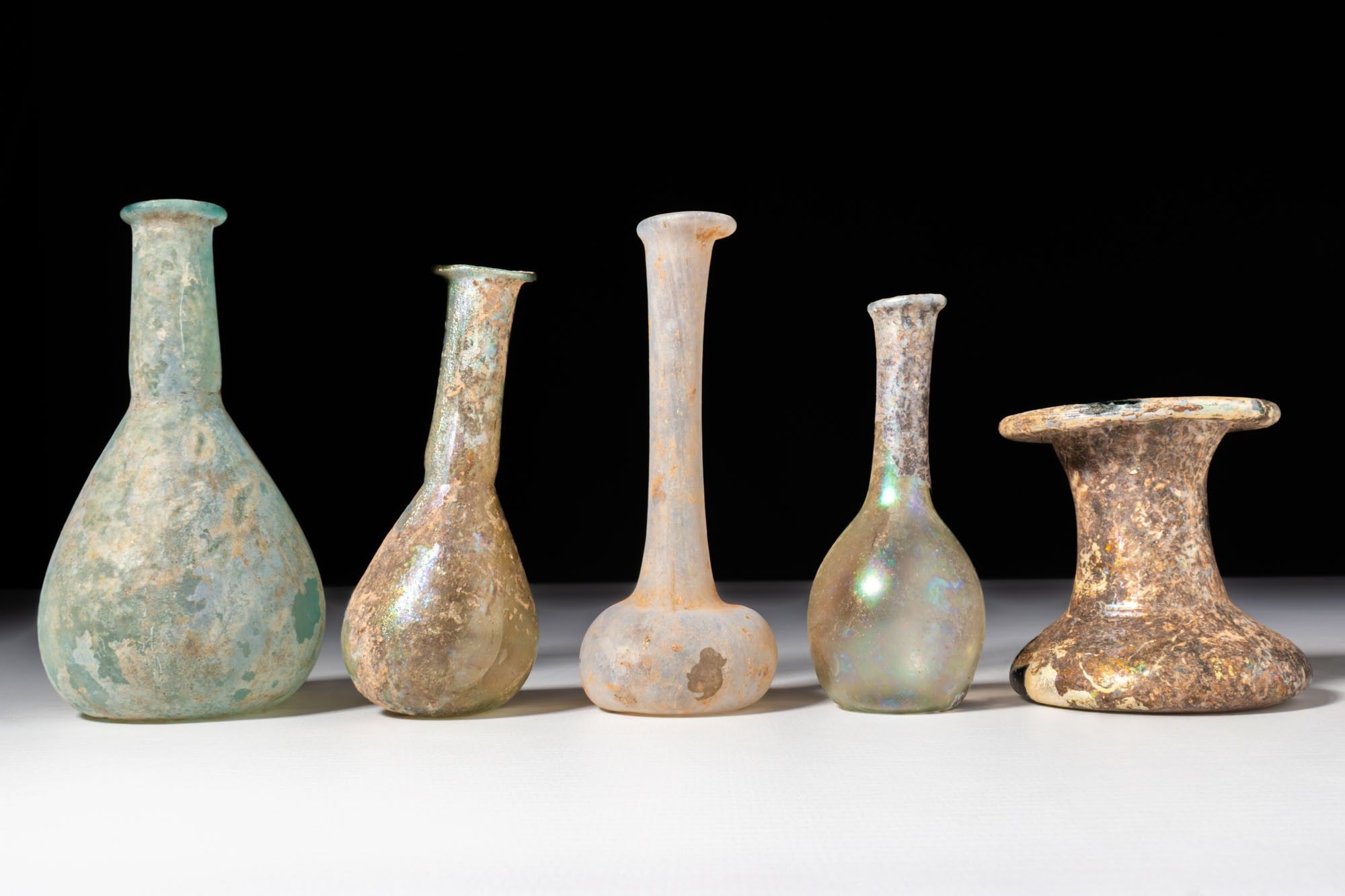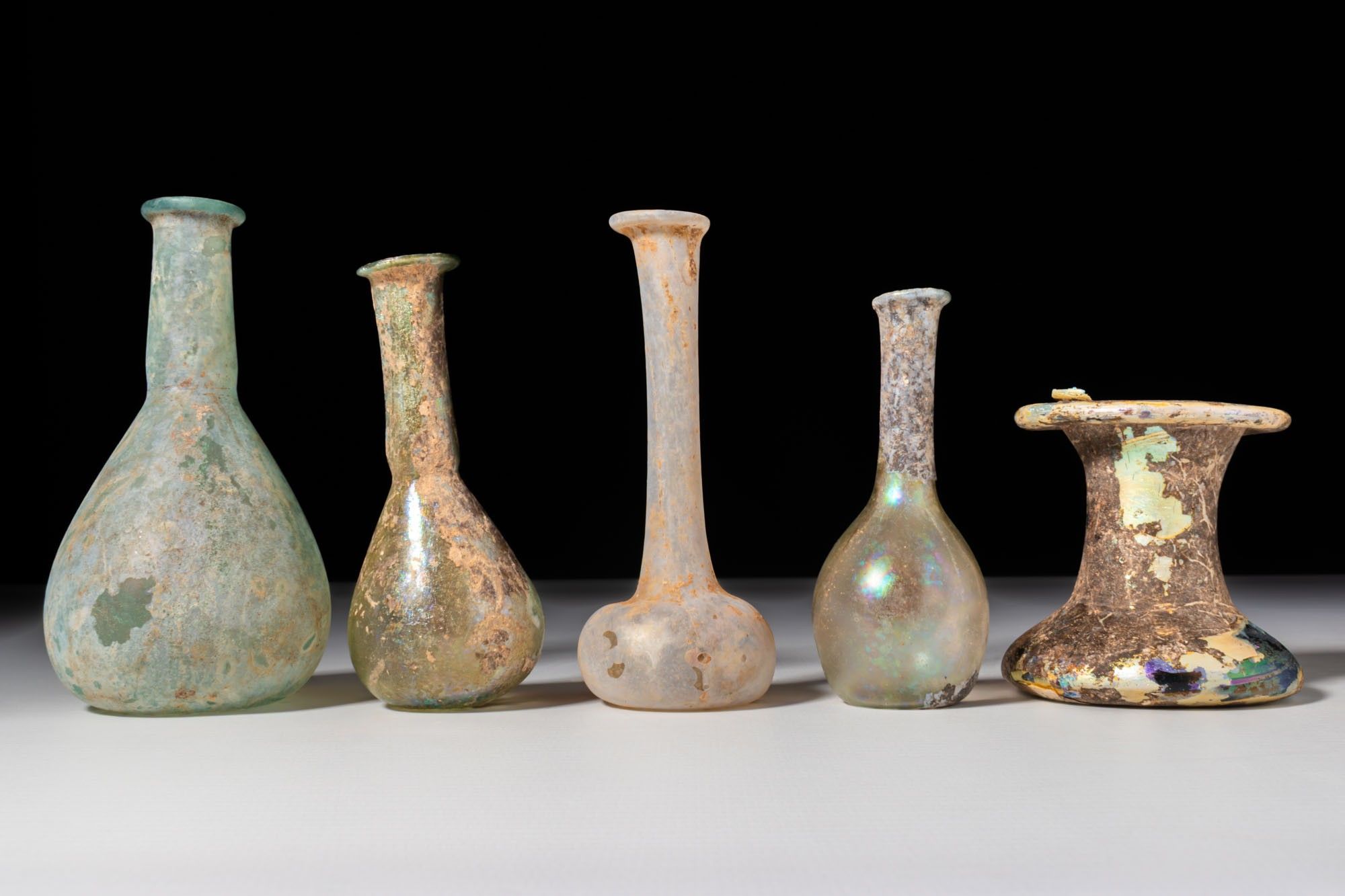 A collection of five glass unguentaria, including, from left to right: a large bottle with a broad pear-shaped body, a straight tubular neck, and a rolled lip; a smaller example with a piriform body, a long neck, and a rounded rim; a candlestick flask formed with a tall cylindrical neck rising from a low domed base and finished with a flat out-turned mouth; a vessel with a globular body and a narrow tubular neck opening to a simple everted lip; and a cosmetic jar with an expansive rim set over a spool-like body on a spreading foot.