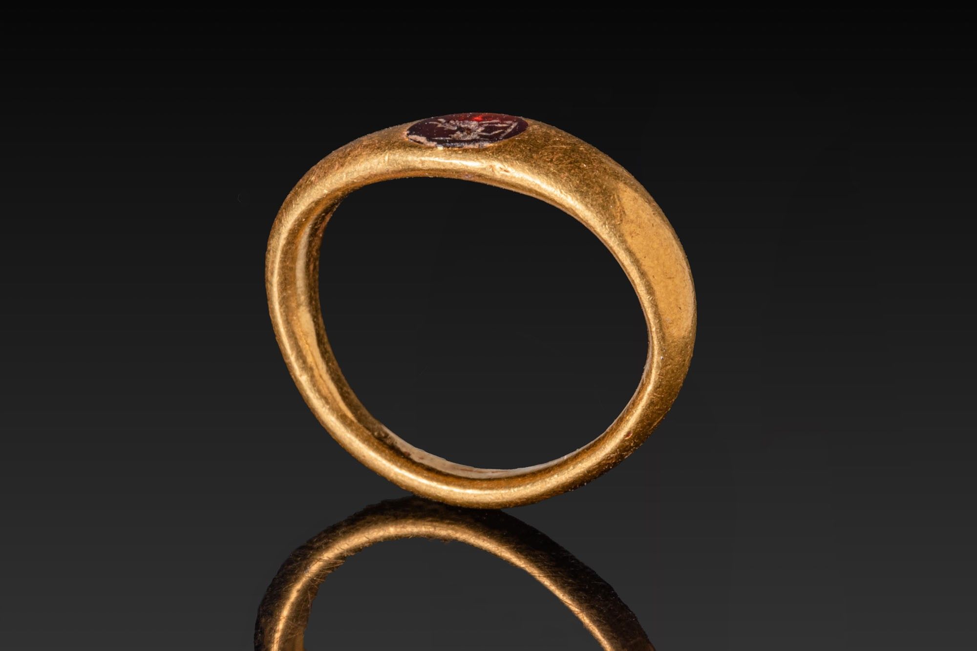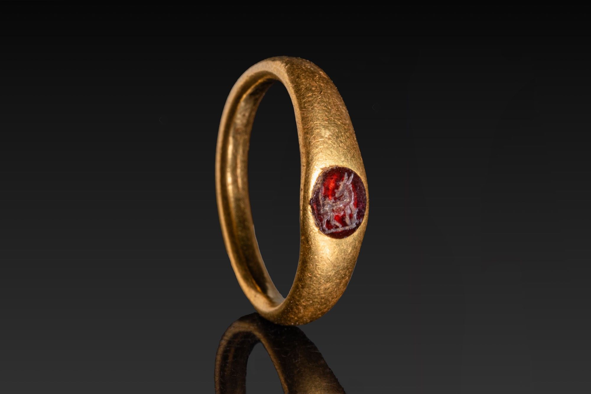 ROMAN HIGH KARAT GOLD RING WITH GARNET INTAGLIO DEPICTING DONKEY.