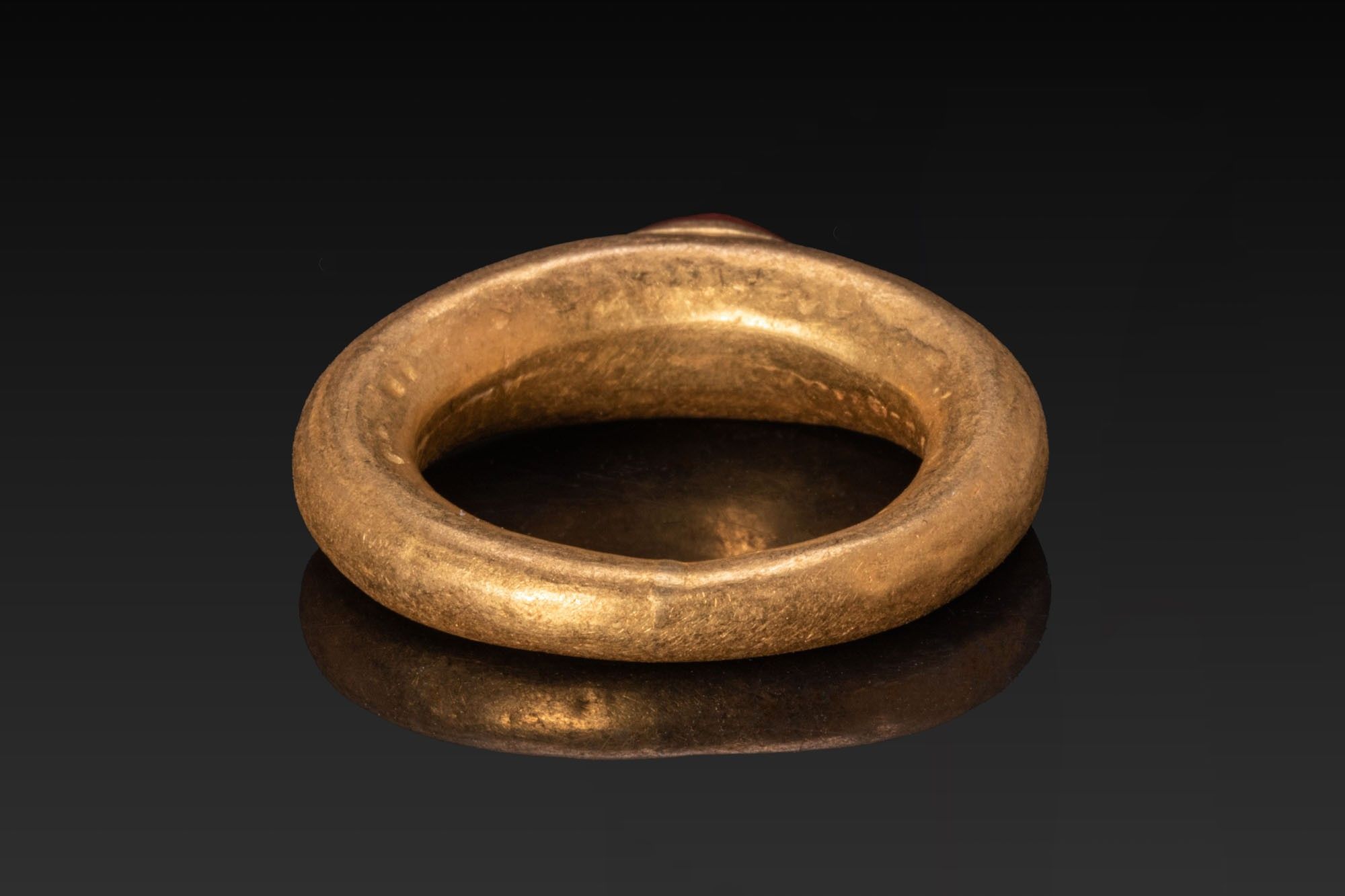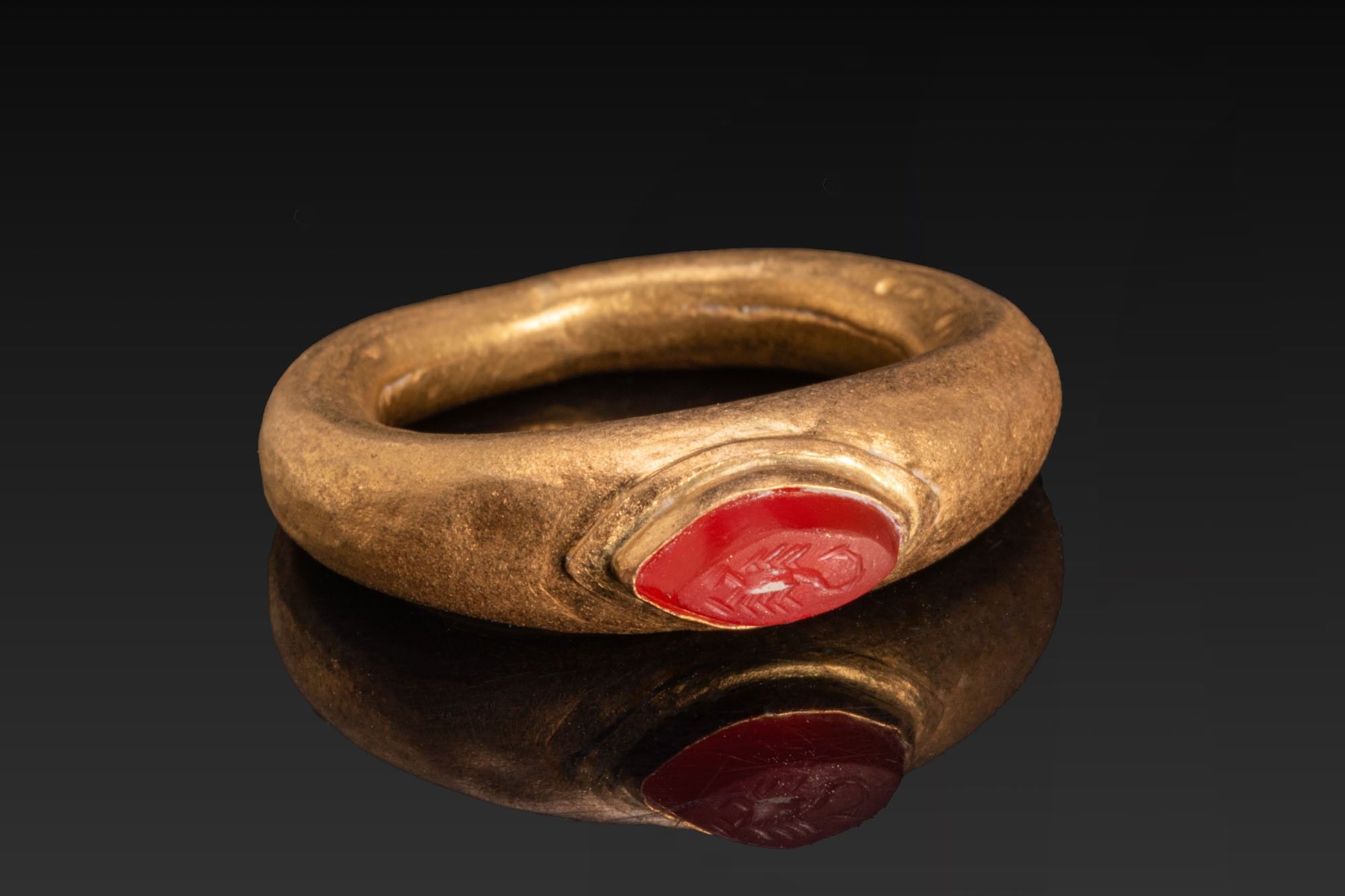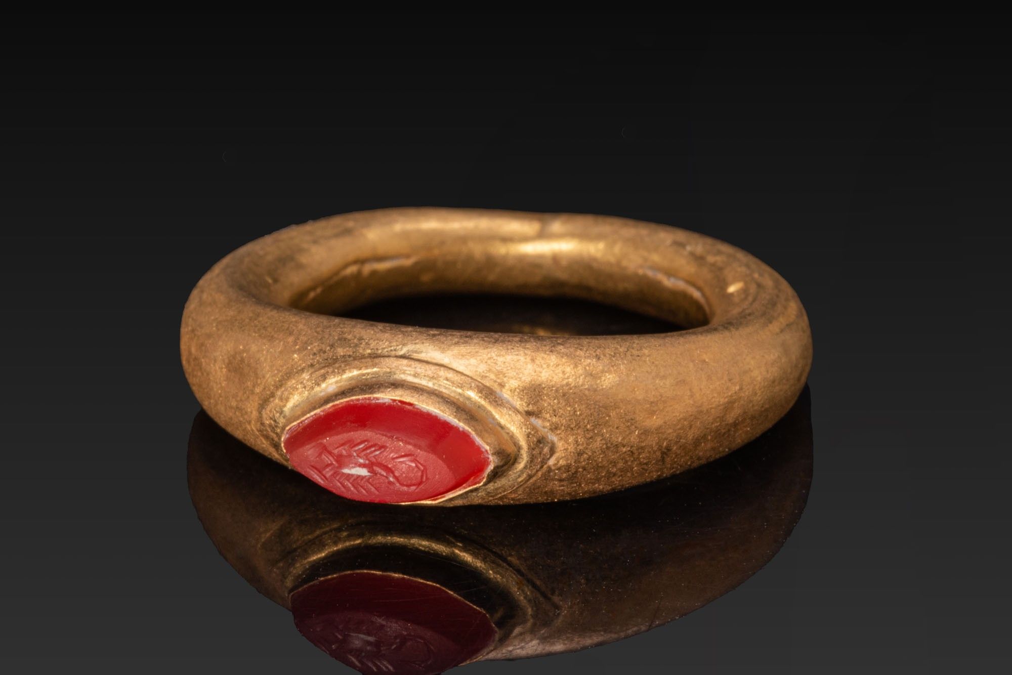 ROMAN RED CARNELIAN INTAGLIO DEPICTING A SCORPION IN GOLD RING.