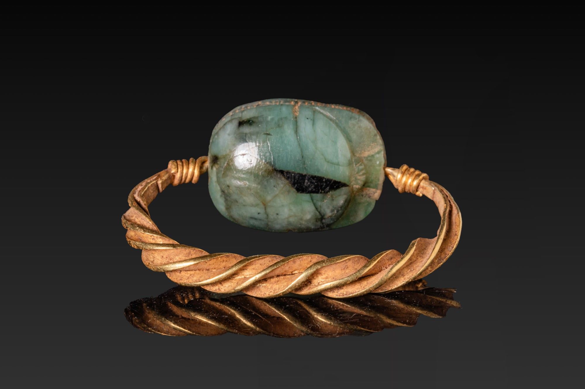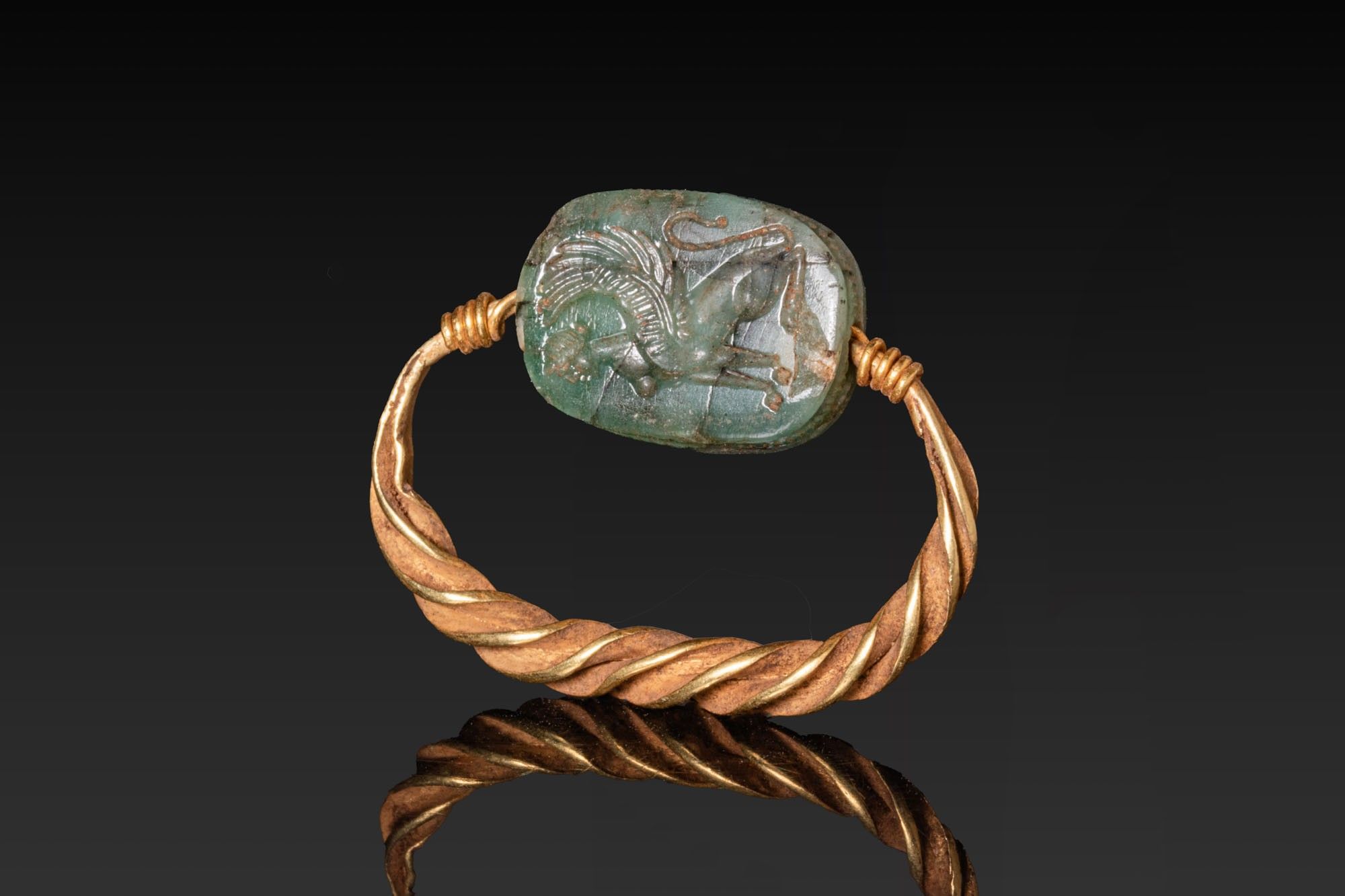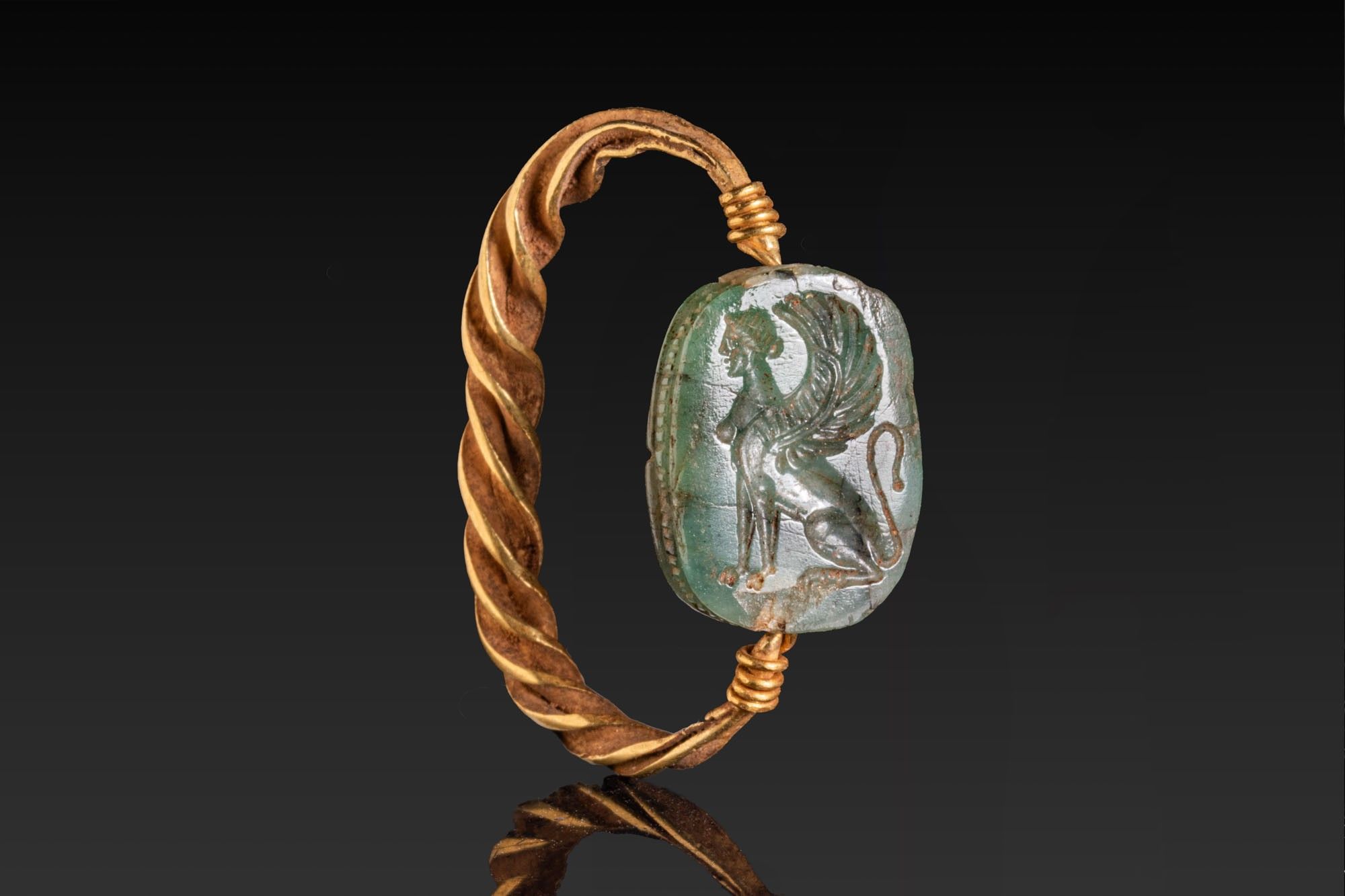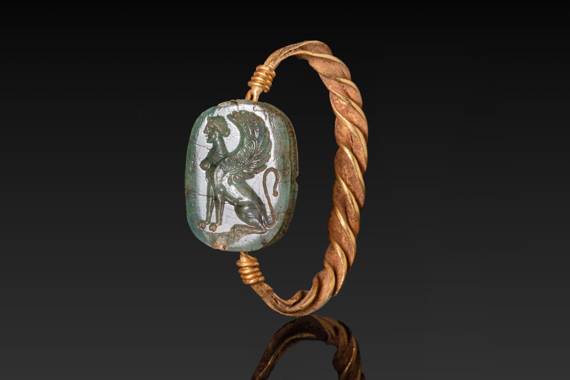 Ca. 500 - 400 BC. A green stone scaraboid engraved on the flat underside with a left-facing sphinx. The female-headed creature is seated with swept plumed wings and a curled tail. Set in a gold ring with a twisted hoop and secured with close-set binding wire. For similar see: Classical Art Research Centre, Record Number: 200000071. Size: D:14.27mm / US: 3 / UK: F 1/2; Weight: 4.6g Provenance: Private UK collection; acquired in Germany; formerly with A. Moser collection, Switzerland 1990s-2000. This item has been cleared against the Art Loss Register database and comes with a confirmation letter.