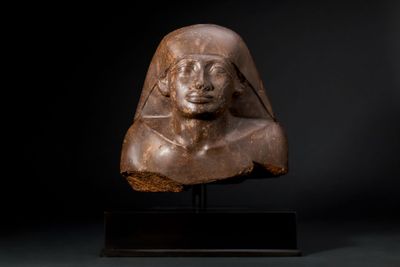 LARGE EGYPTIAN RED QUARTZITE BUST OF MAN WITH DOUBLE WIG. Ne…