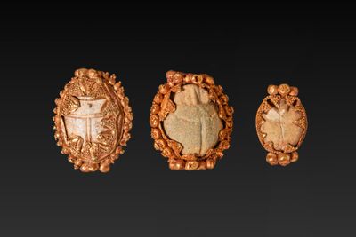 COLLECTION OF EGYPTIAN FAIENCE SCARABS IN GOLD FRAMES WITH G…