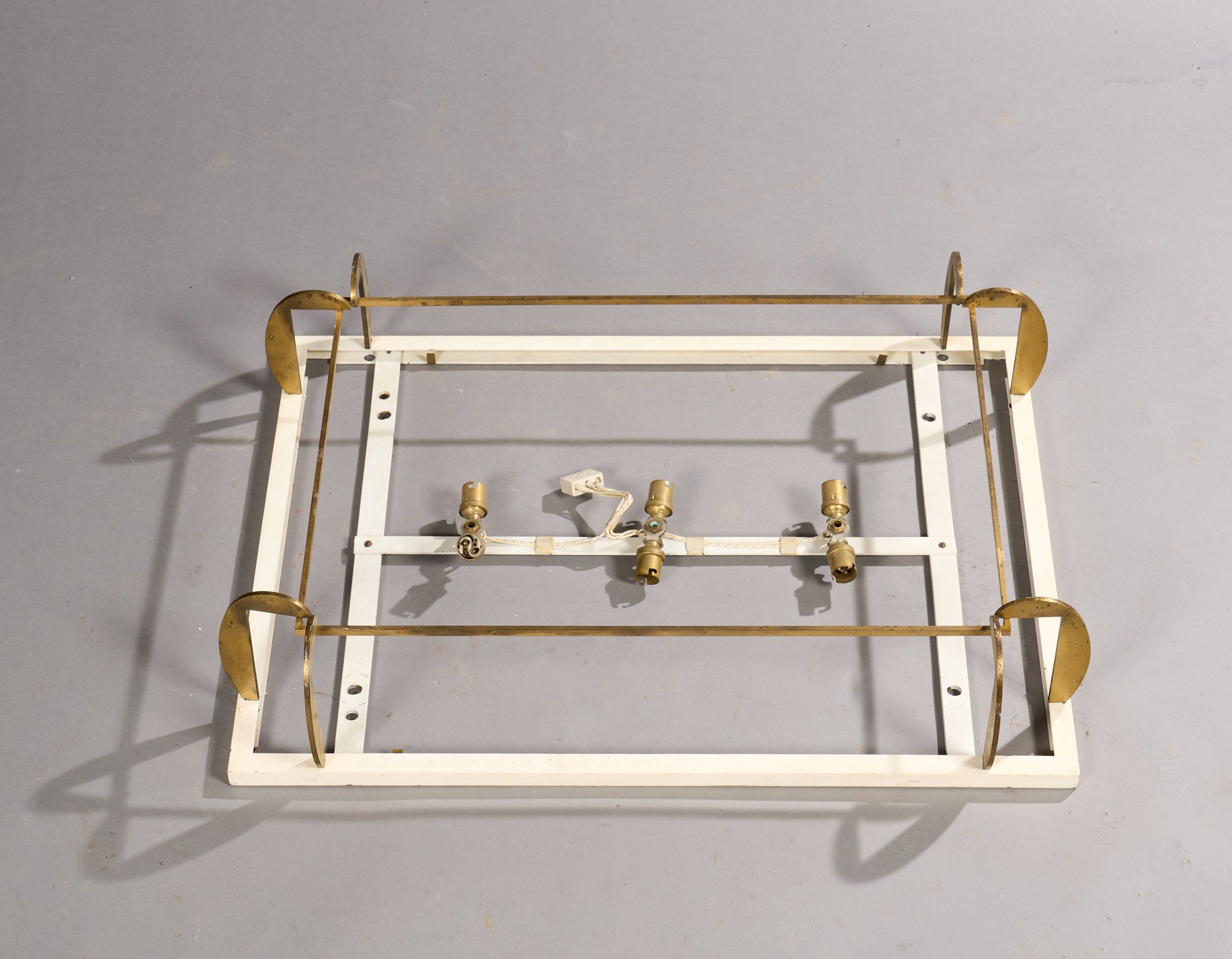 Rectangular ceiling light structure in brass and white lacquered metal with stepped edge held in place by two rounded blades per side