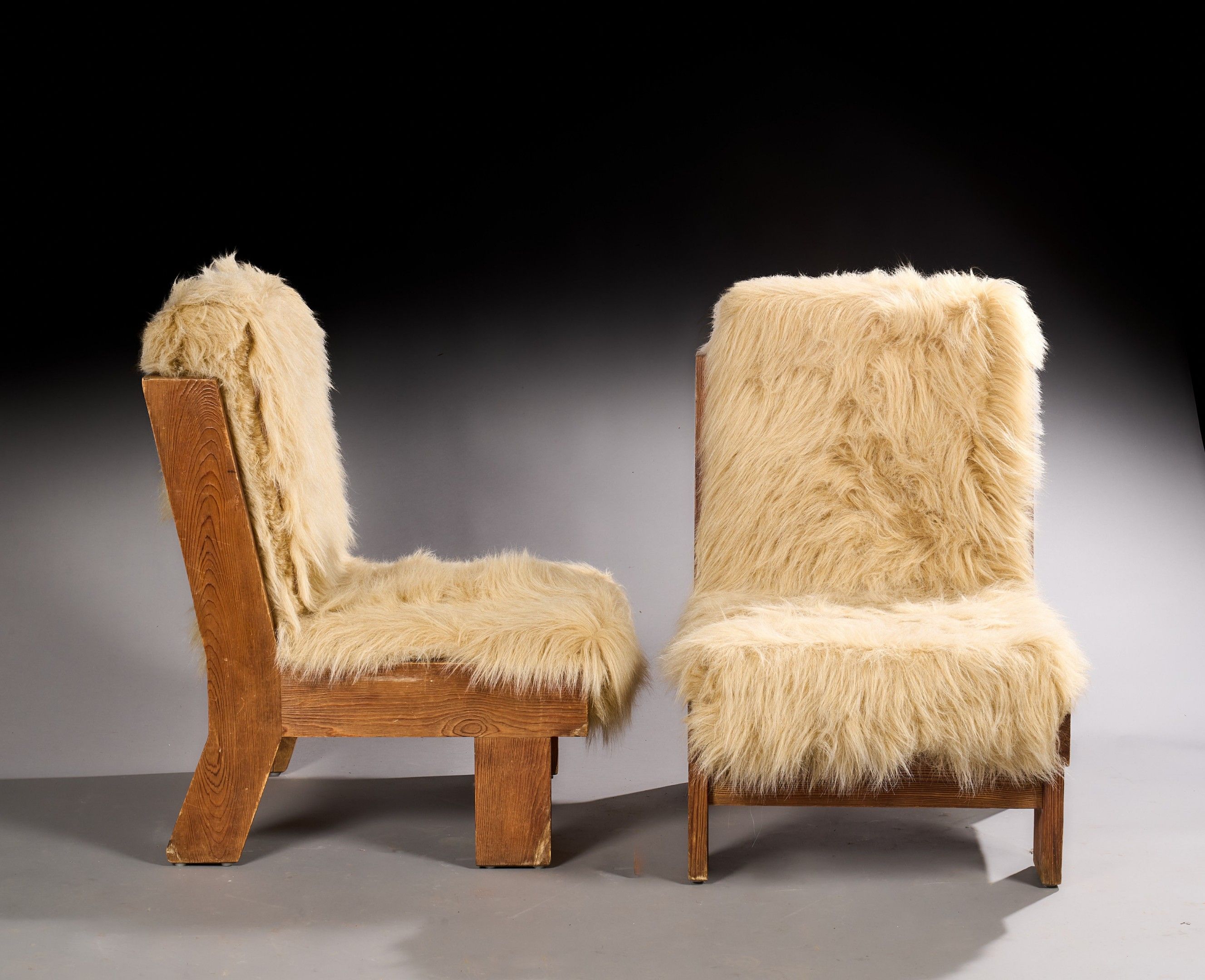 Pair of sandblasted and stained pine armchairs with square white faux fur cushions