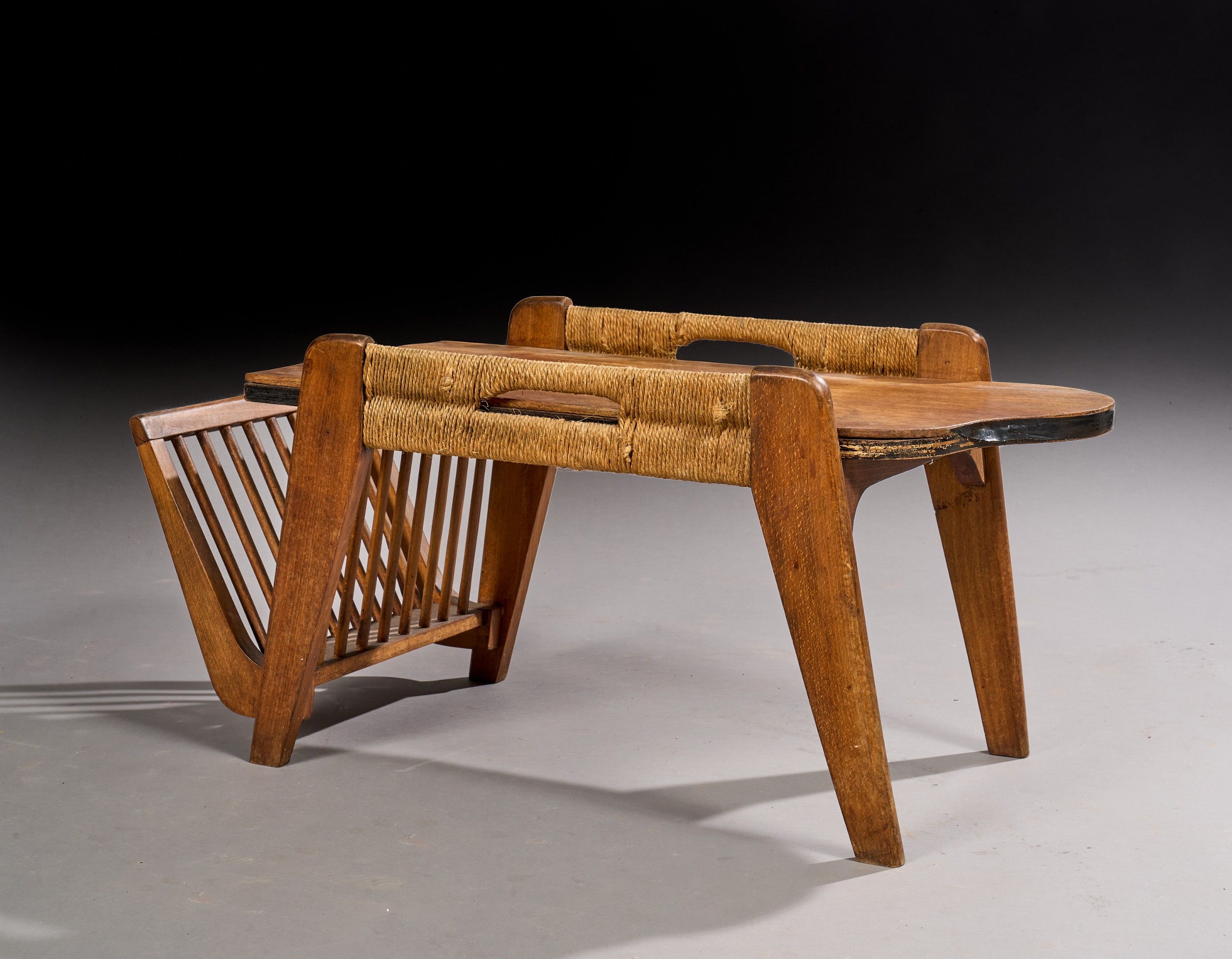 Coffee table with free-form top on profiled legs with lateral newspaper holders, mulched belt on the long sides