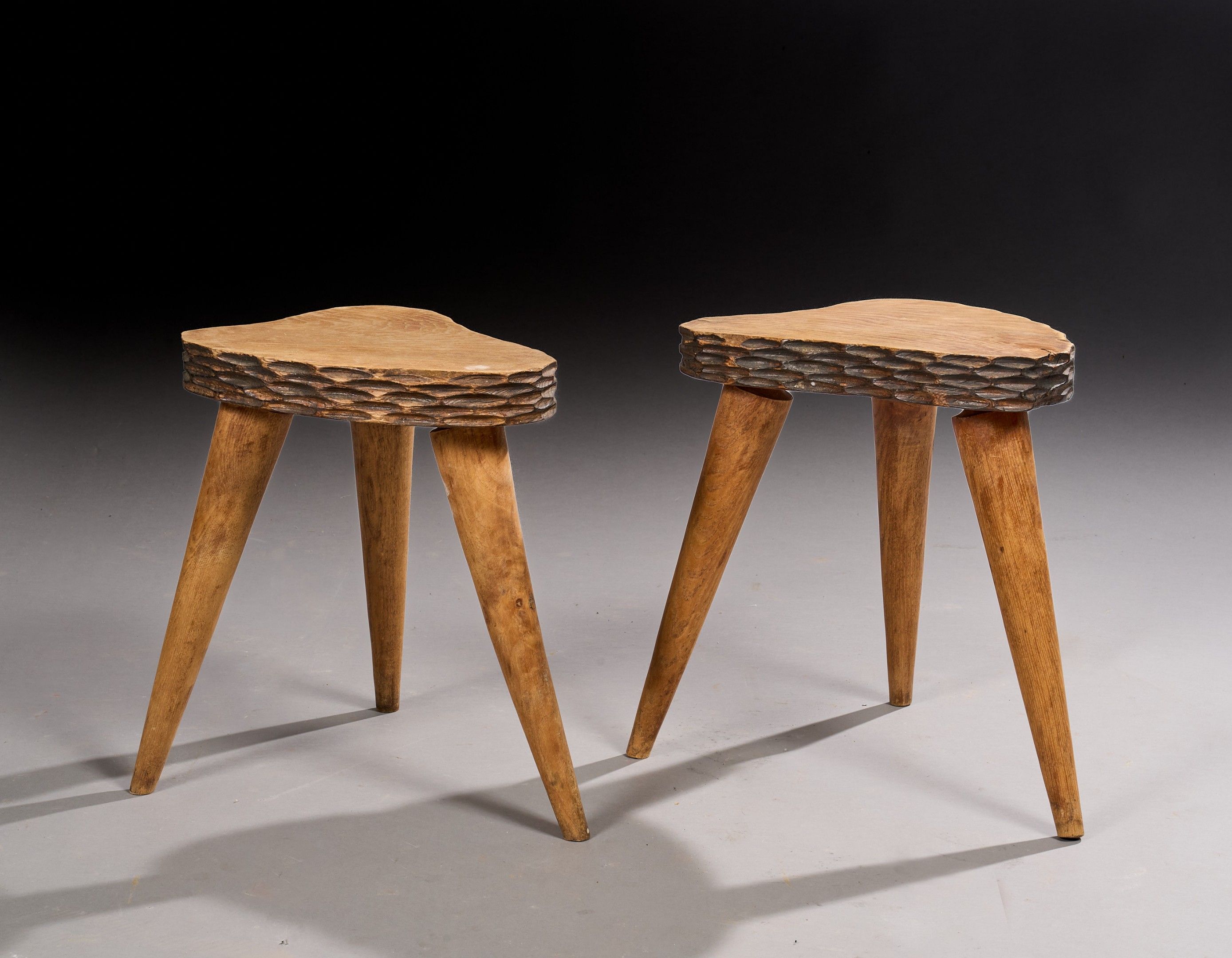 Pair of stools in natural wood with a libr shape seat, thickness gouged out on three tapered legs