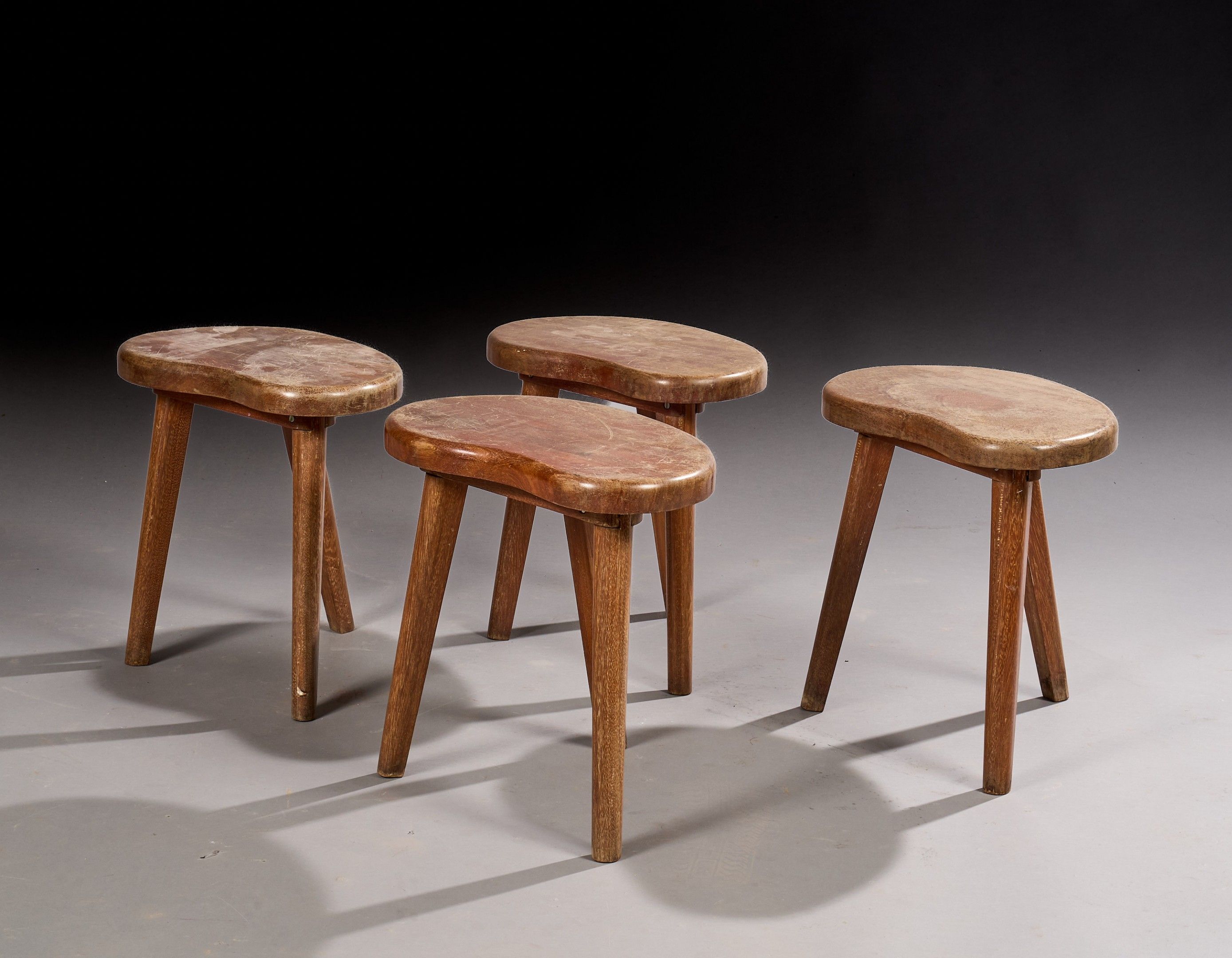 Suite of four low wooden stools with kidney-shaped seats in natural wood on three tapered legs