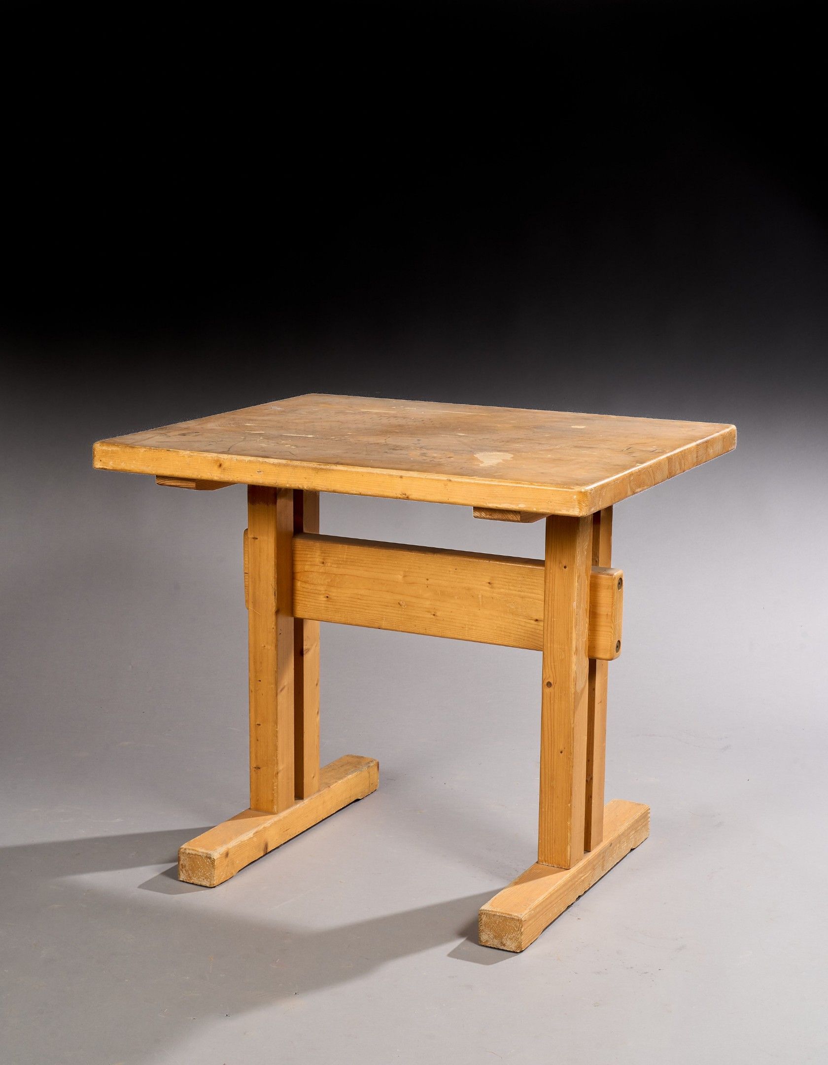 For the Arcs ? Table with rectangular pine top on inverted T-shaped side frames and cross brace