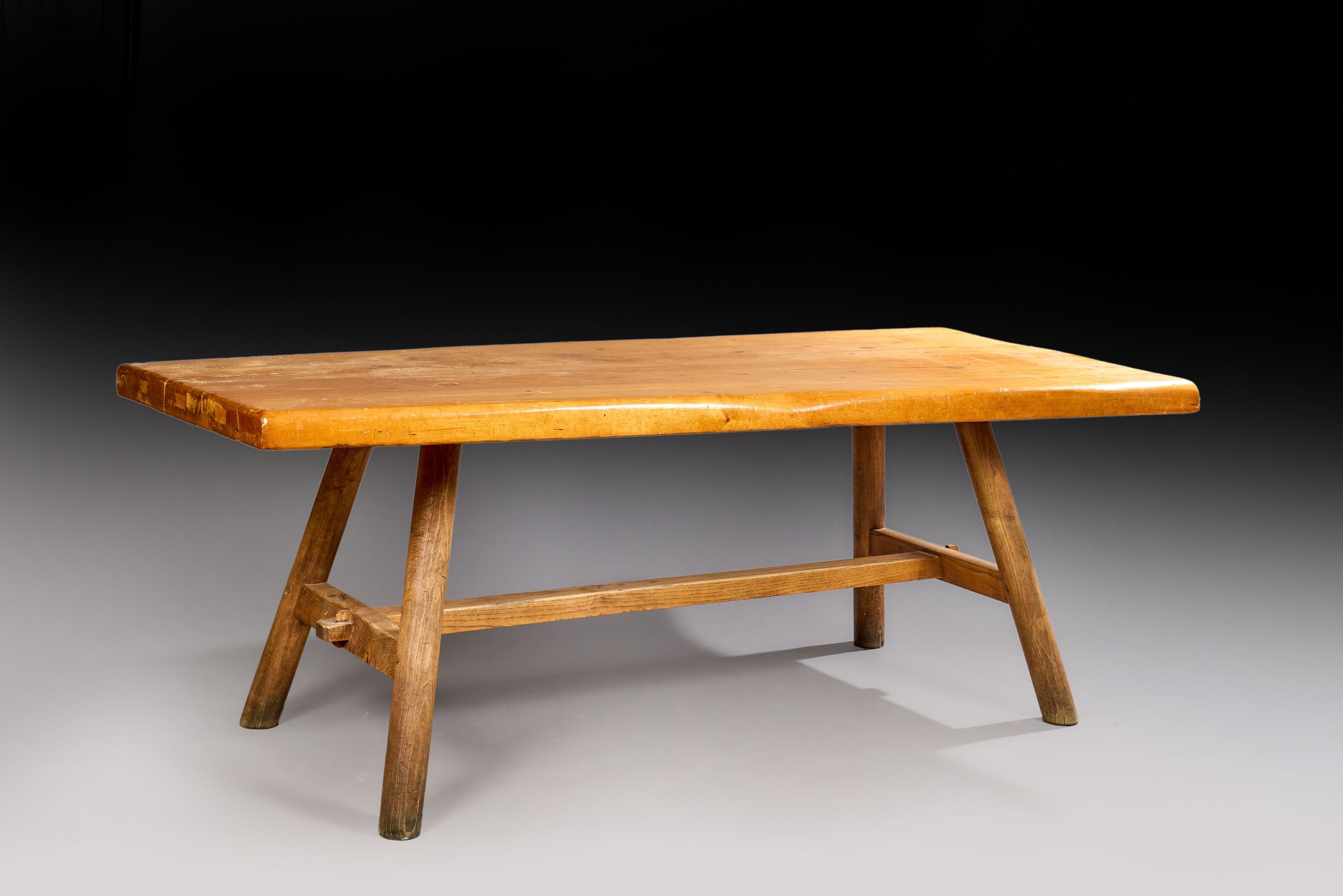 Table with thick rectangular pine top on four angled cylindrical legs joined by an H-shaped brace.