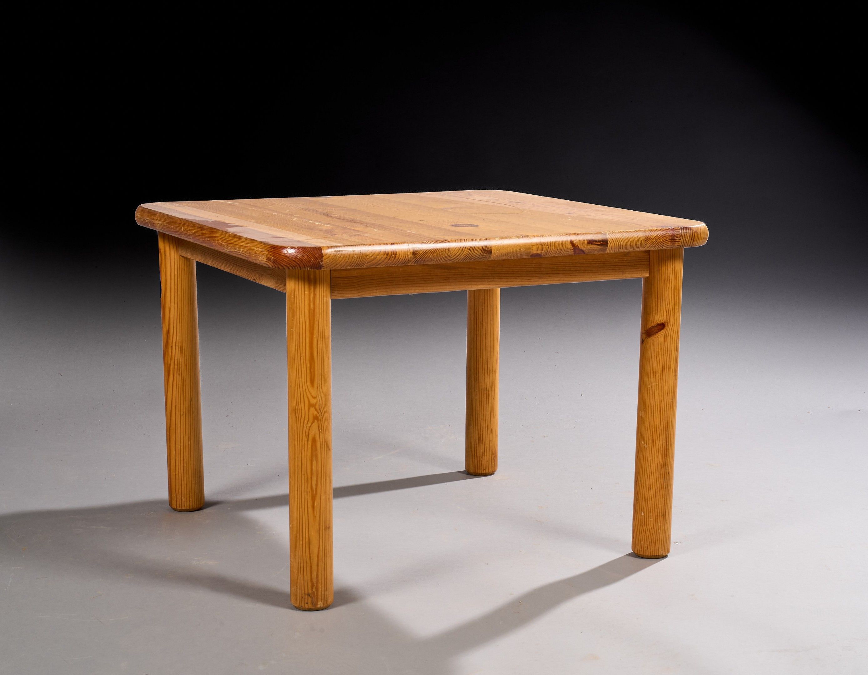 Square coffee table with pine slat top on recessed belt and four angular legs