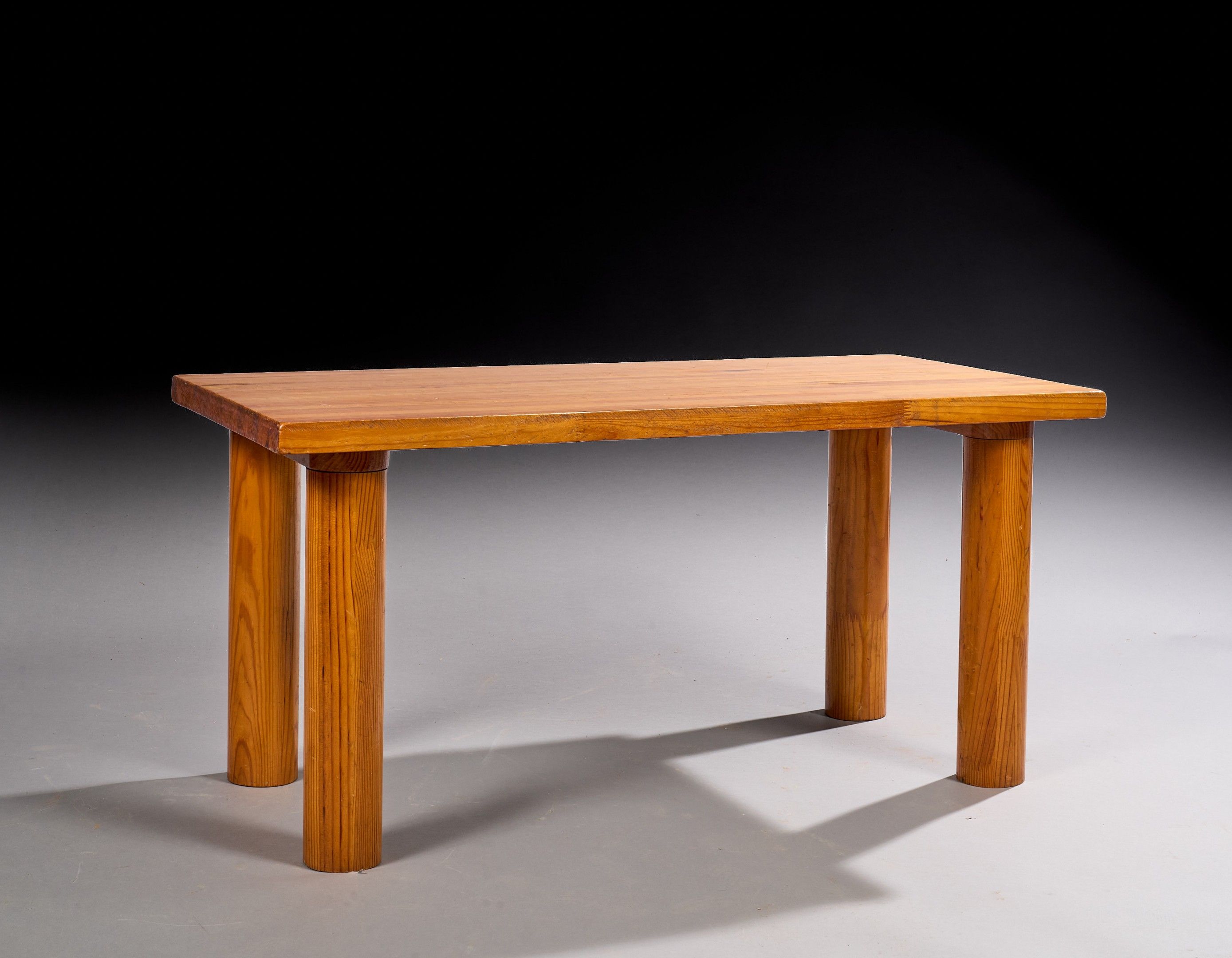 Coffee table with rectangular pine slat top on four cylindrical legs