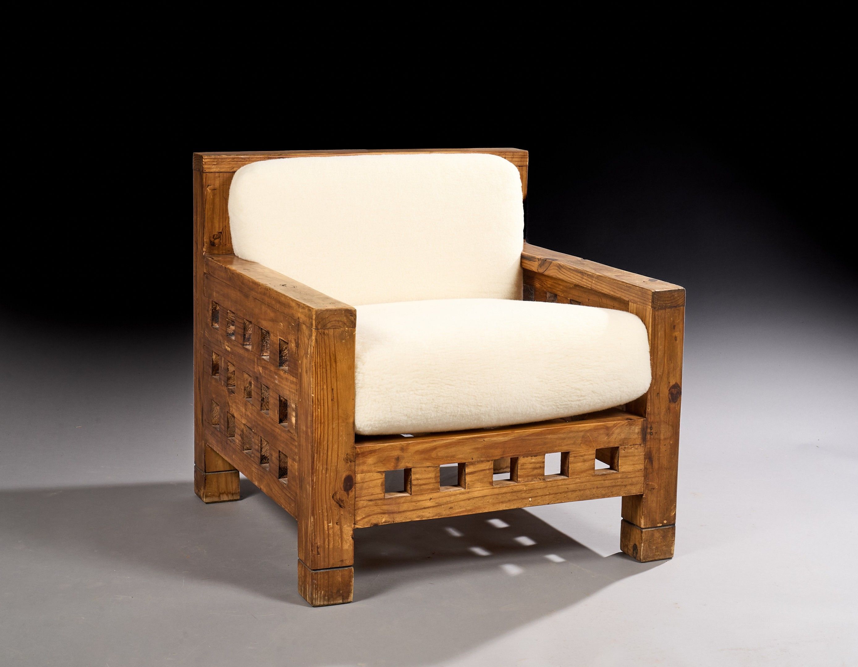 Pair of large cubic armchairs in crossed pine slats with two cushions upholstered in new white woollen fabric