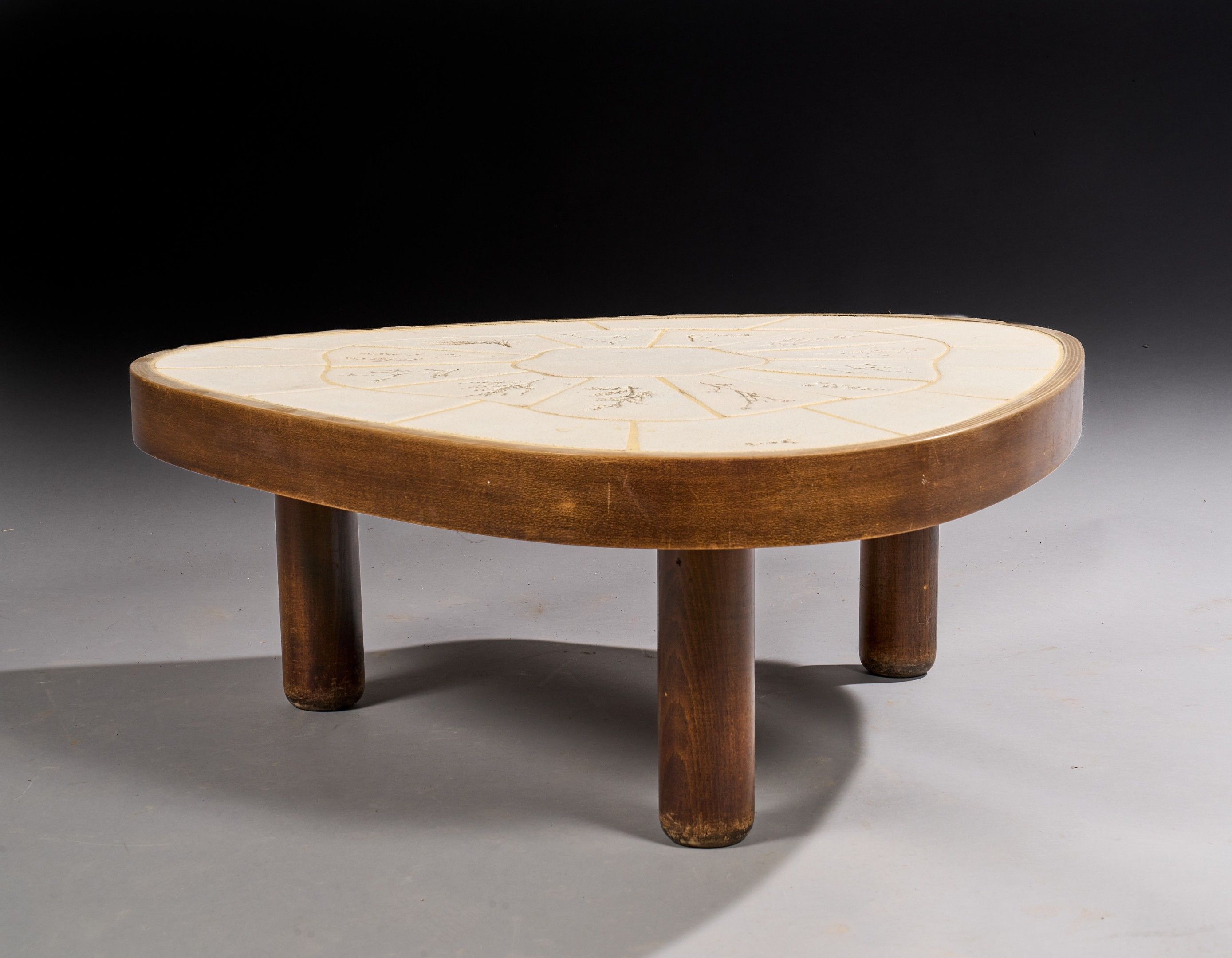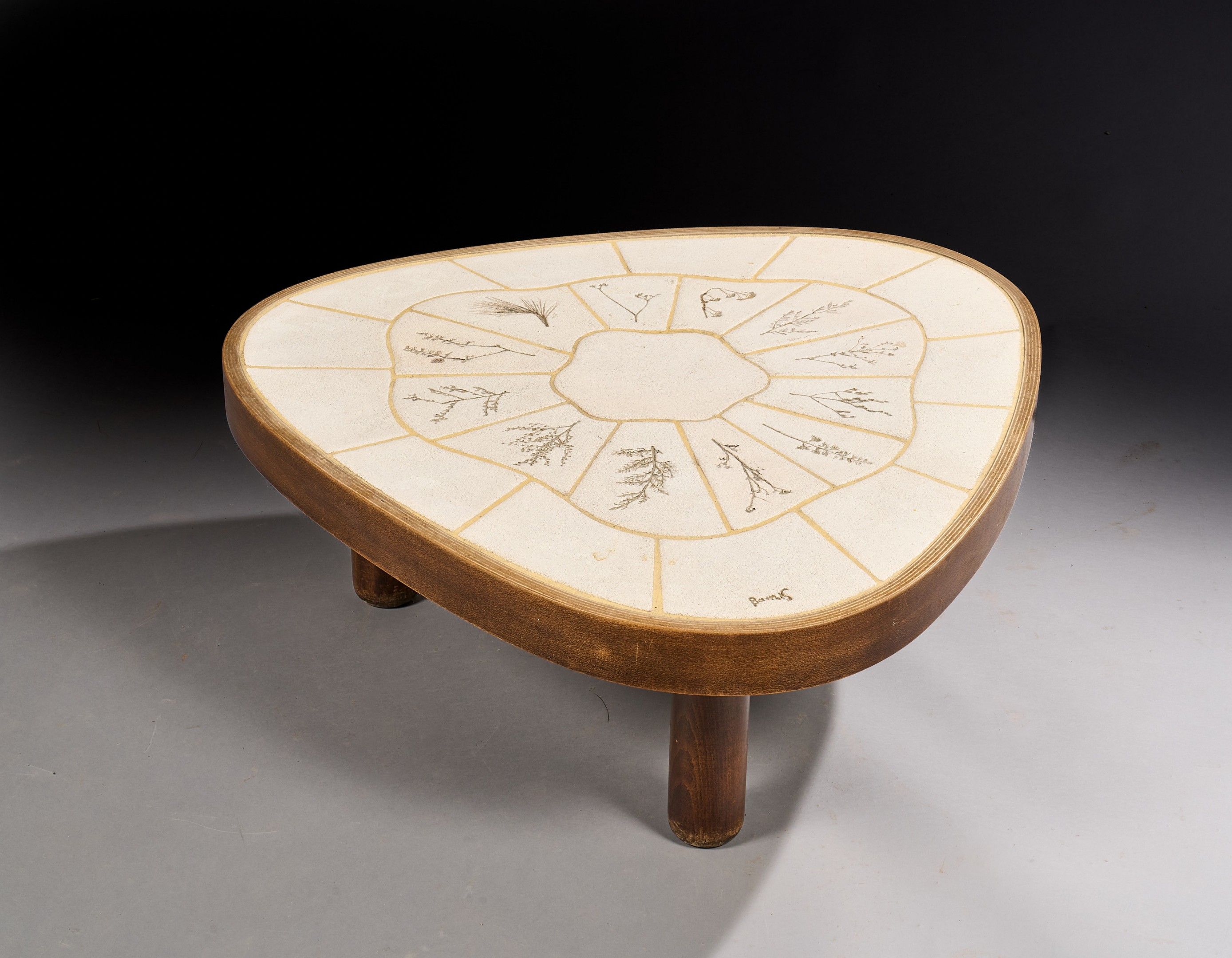 Coffee table with a triangular top with rounded corners in ceramic tiles, including a frieze with an imprint of various herbs in a belt signed BARROIS.