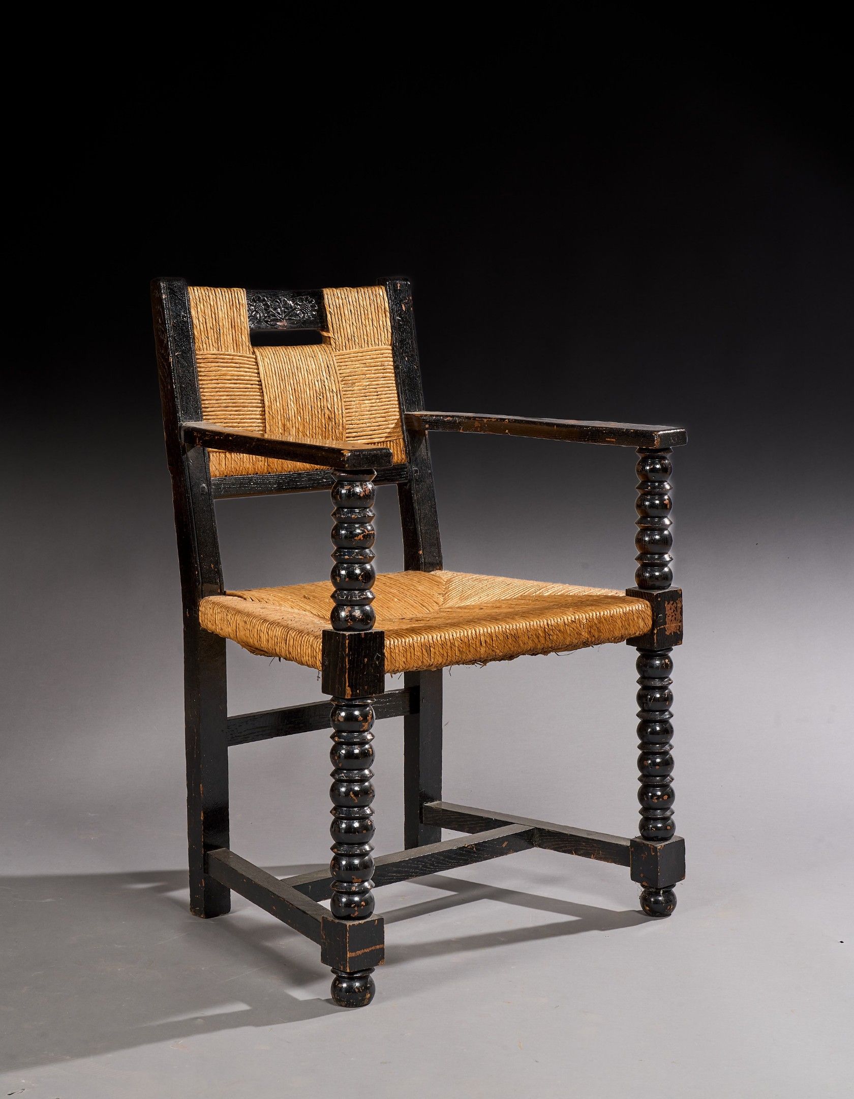 Dans Le Gout De Charles DUDOUYT 51885-1946) Blackened and varnished oak armchair with rosary feet and front legs, slightly curved rectangular back carved with flowers,