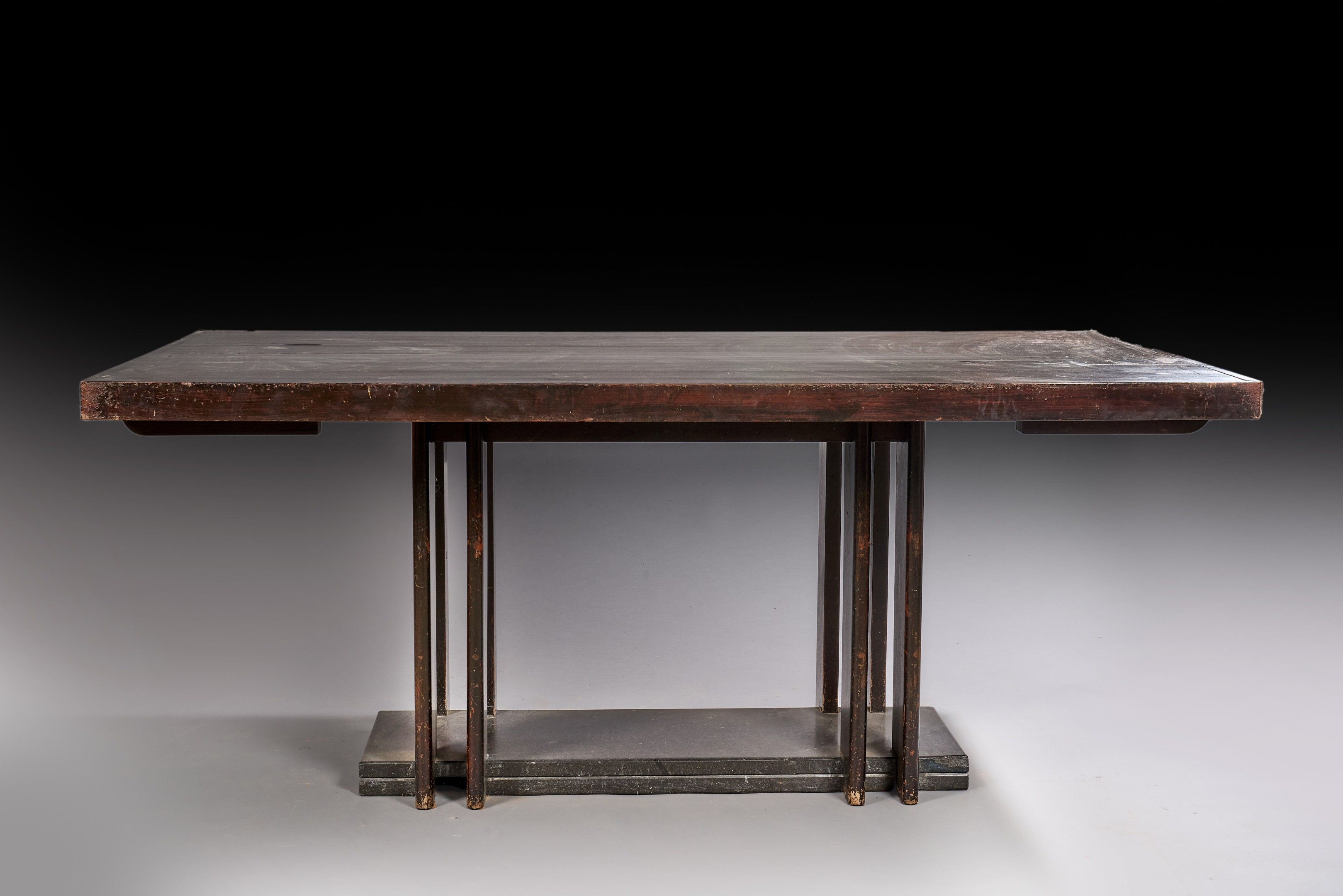 Blackened wood table with rectangular top on four matching double legs and black marble top