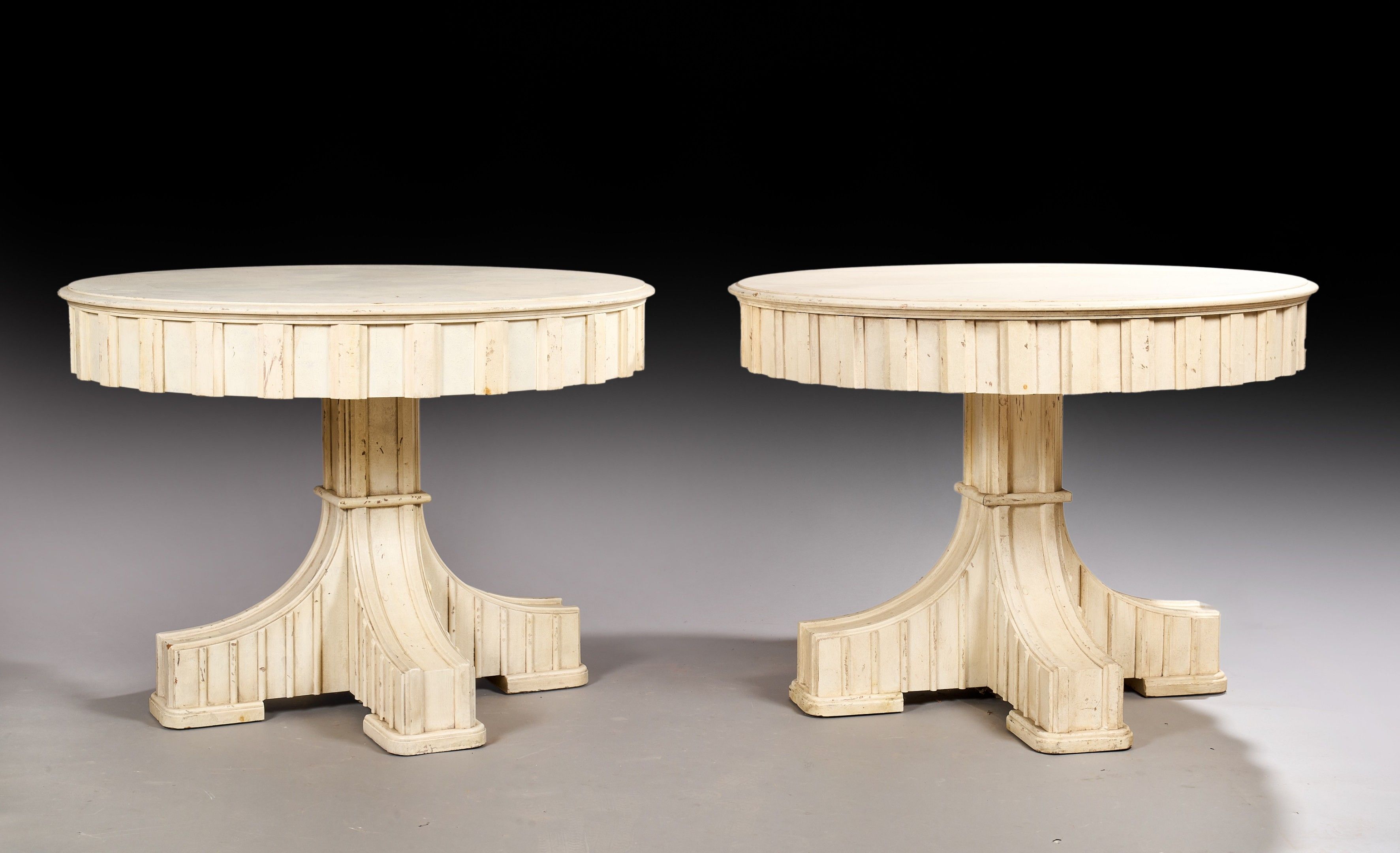 Two large white wooden pedestal tables forming a pair with a circular top on a flat gadroon belt, grooved cruciform legs.