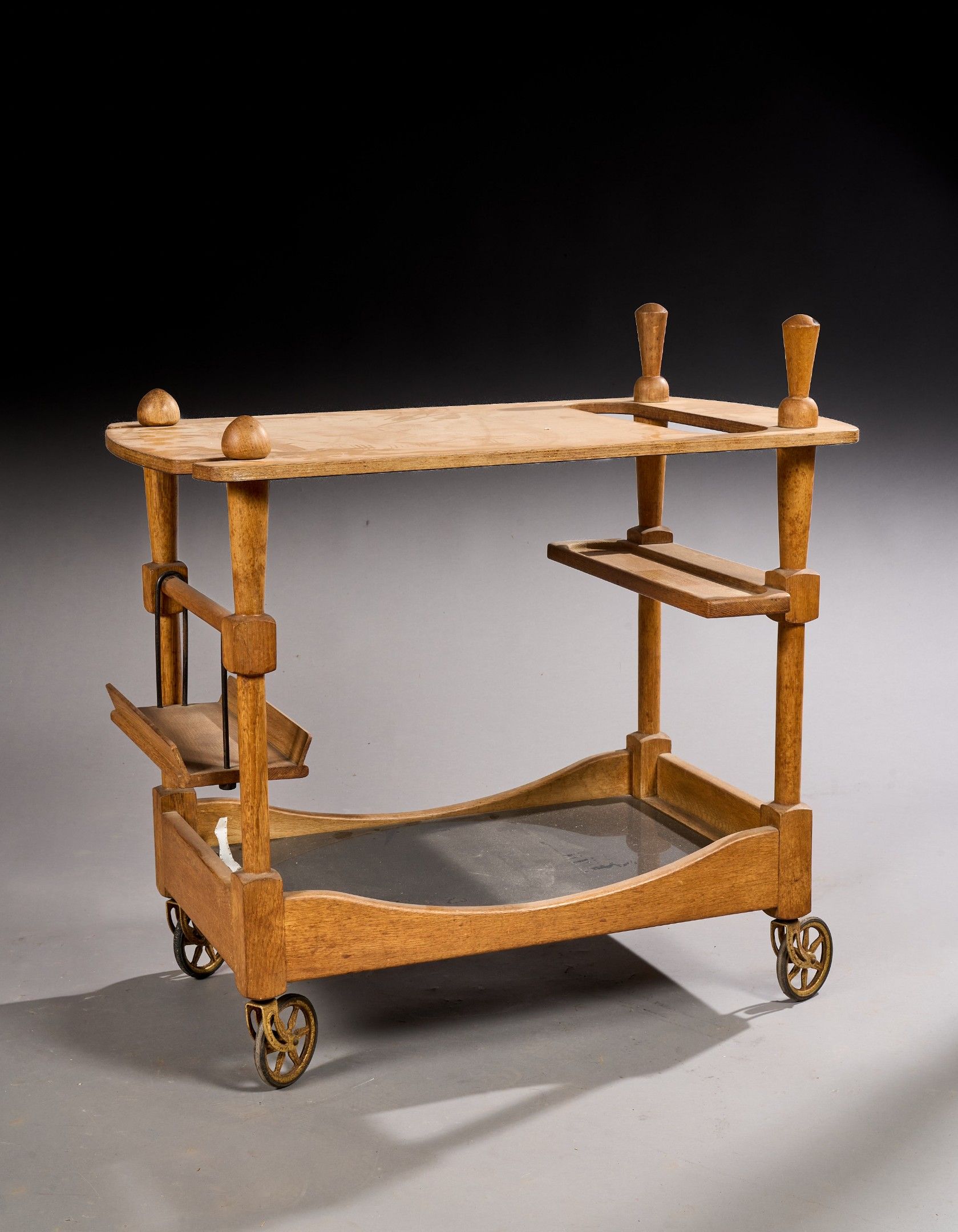 Oak and oak veneer trolley table with a rectangular top cut out on one side for bottles, a glass top at the bottom, four swivel wheels