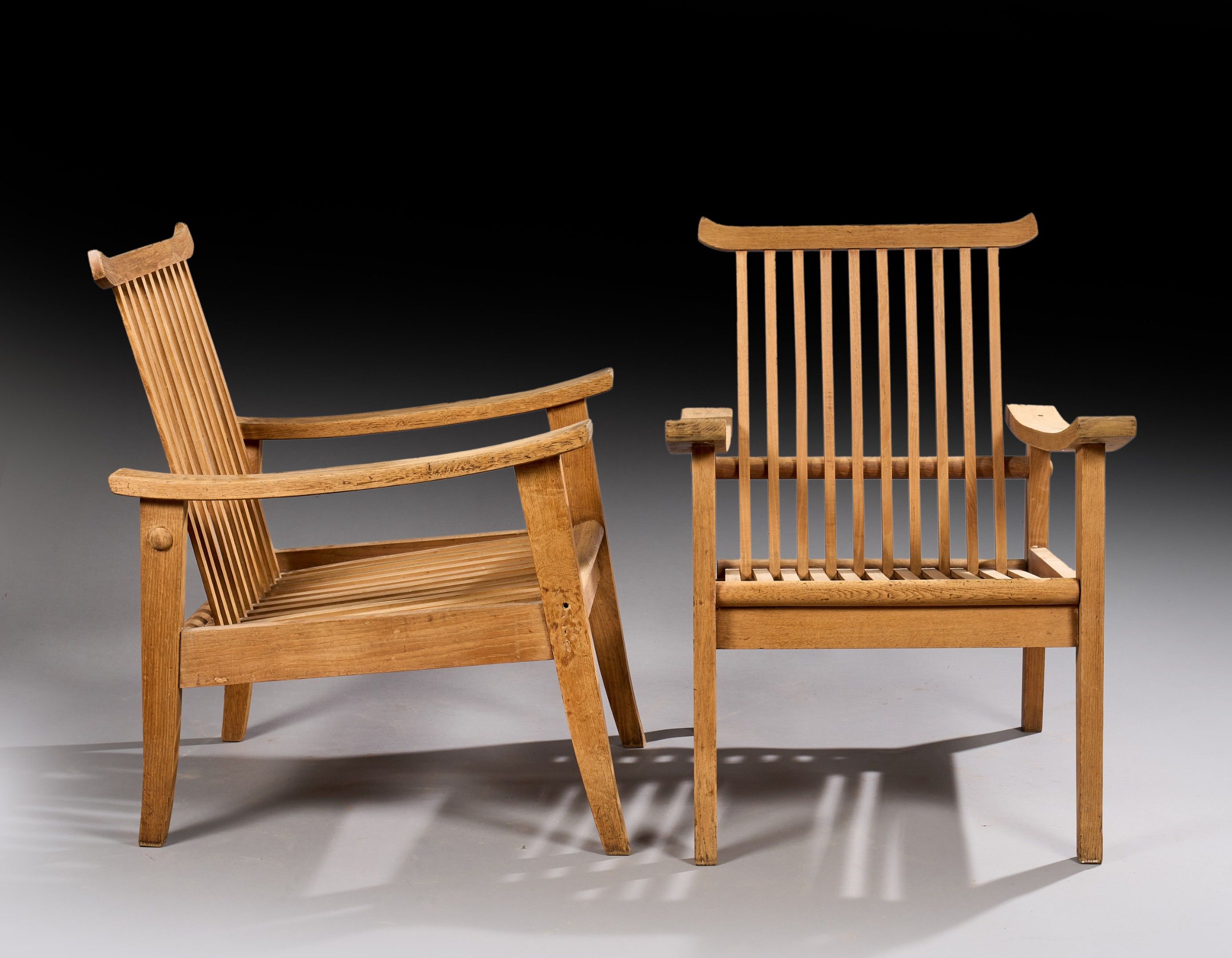 Pair of Japanese-style ashwood armchairs with flat, slightly curved armrests, slatted backs and small raised end bands