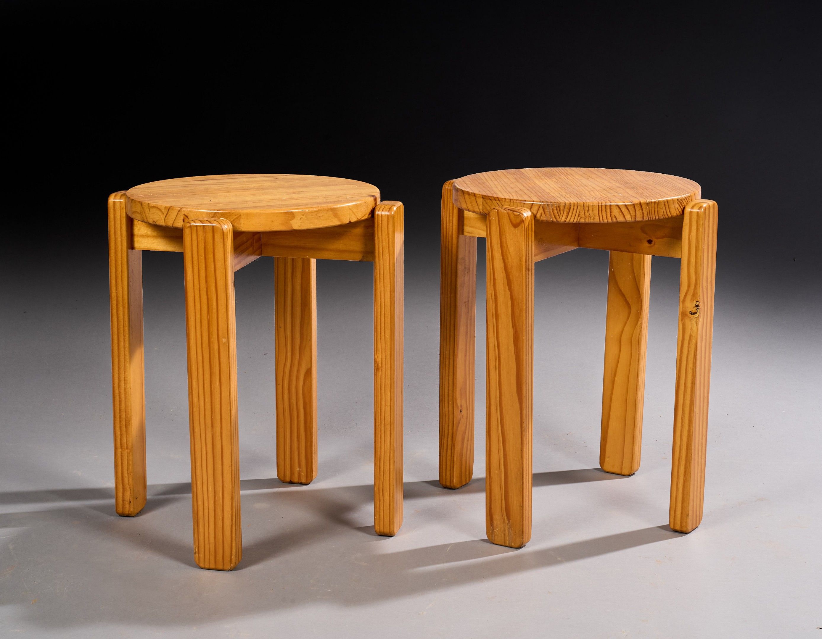 Scandinavian work Pair of pine blade stools with circular seat on a cruciform belt with four rounded-edged blade legs