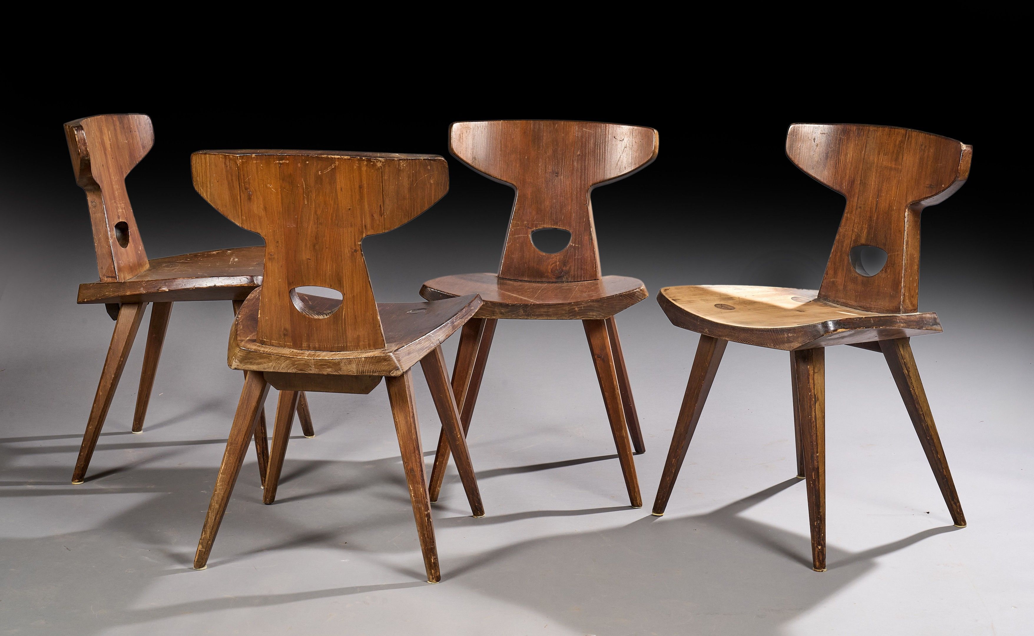 Set of four stained-wood chairs, cut-out back with projecting entablature and hollowed-out grip, curved seat, four angled sheath legs circa 1960