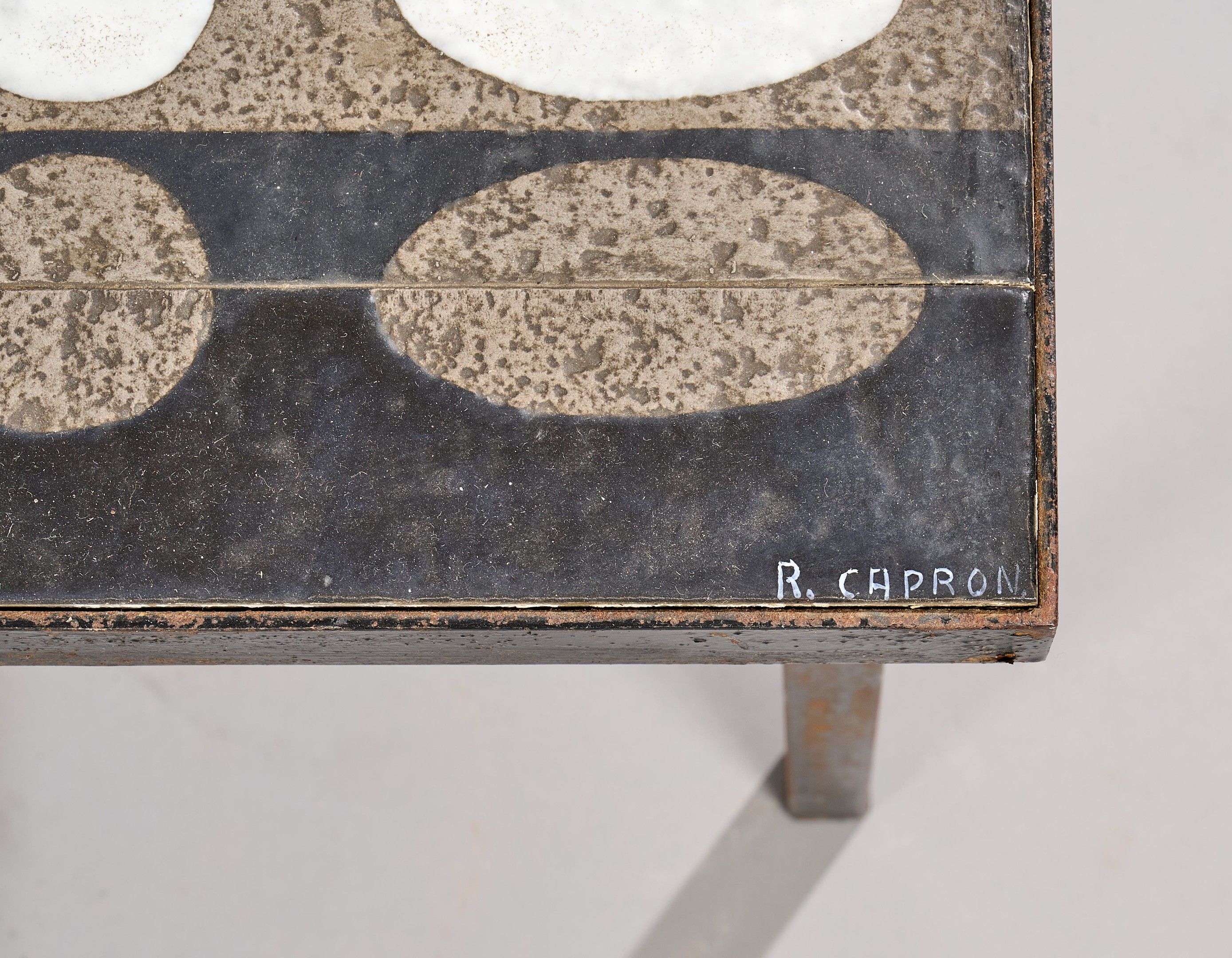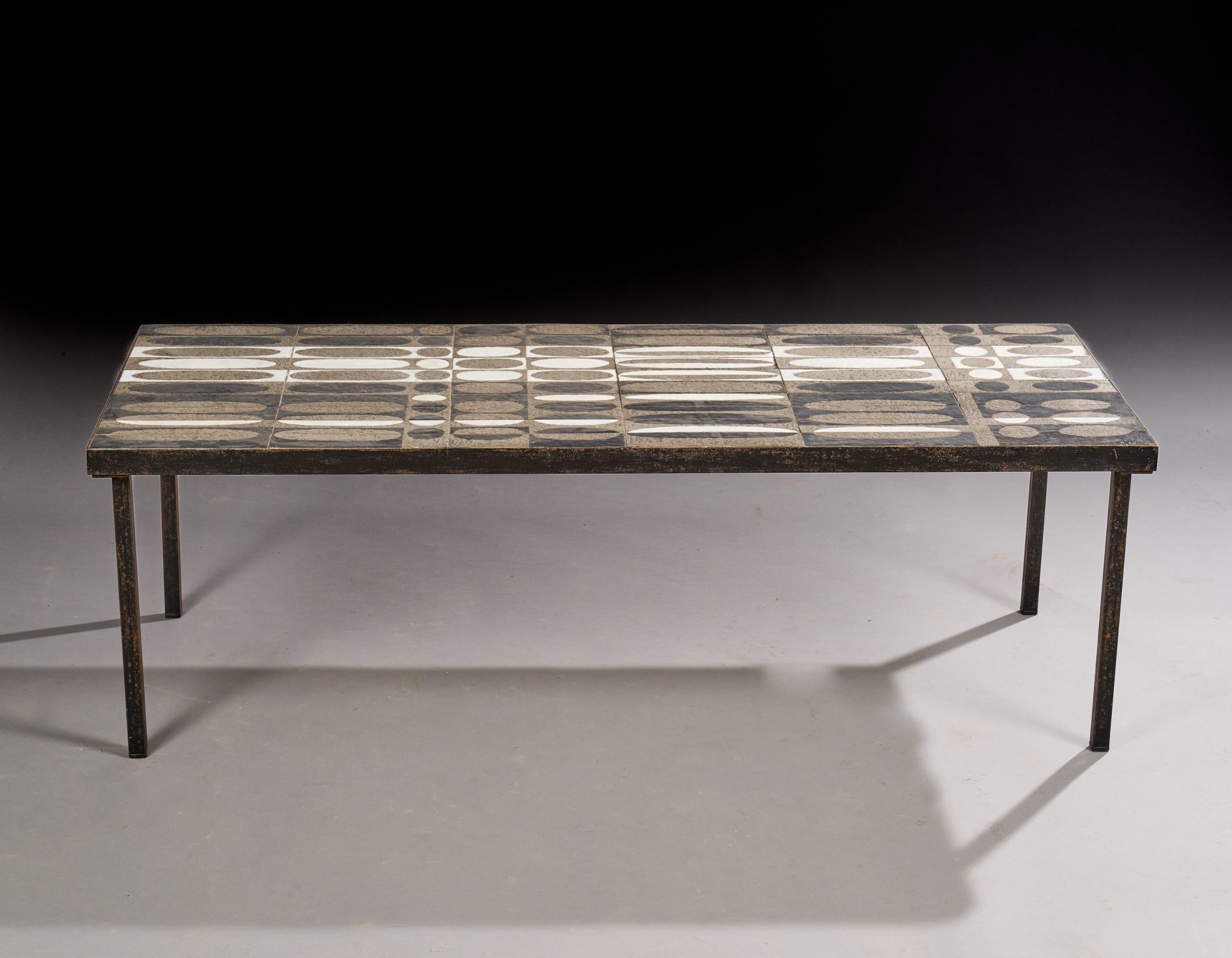 Coffee table with rectangular top of ceramic tiles in shades of grey and glazed white ovals