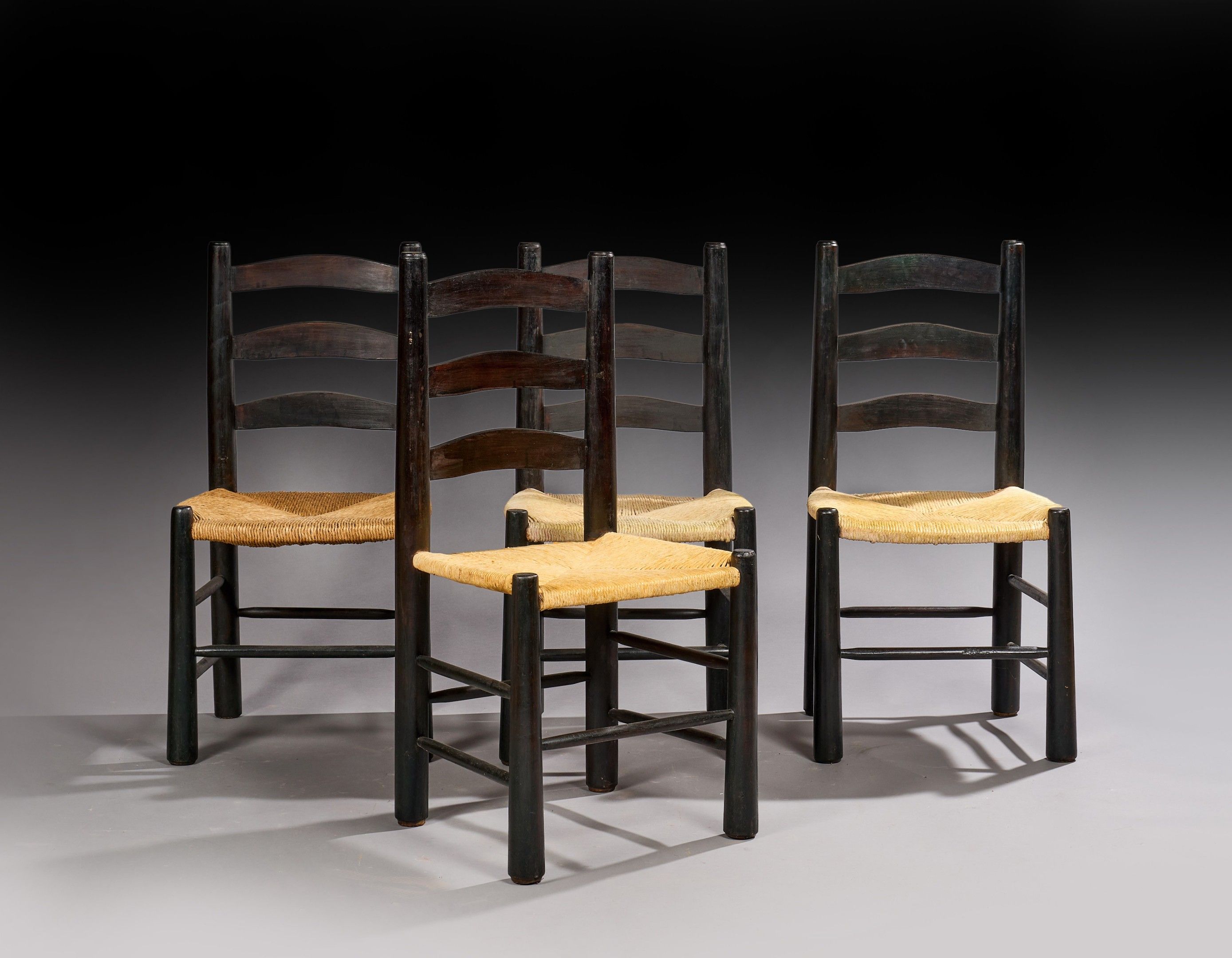 Suite of four chairs in blackened wood with three curved ban…