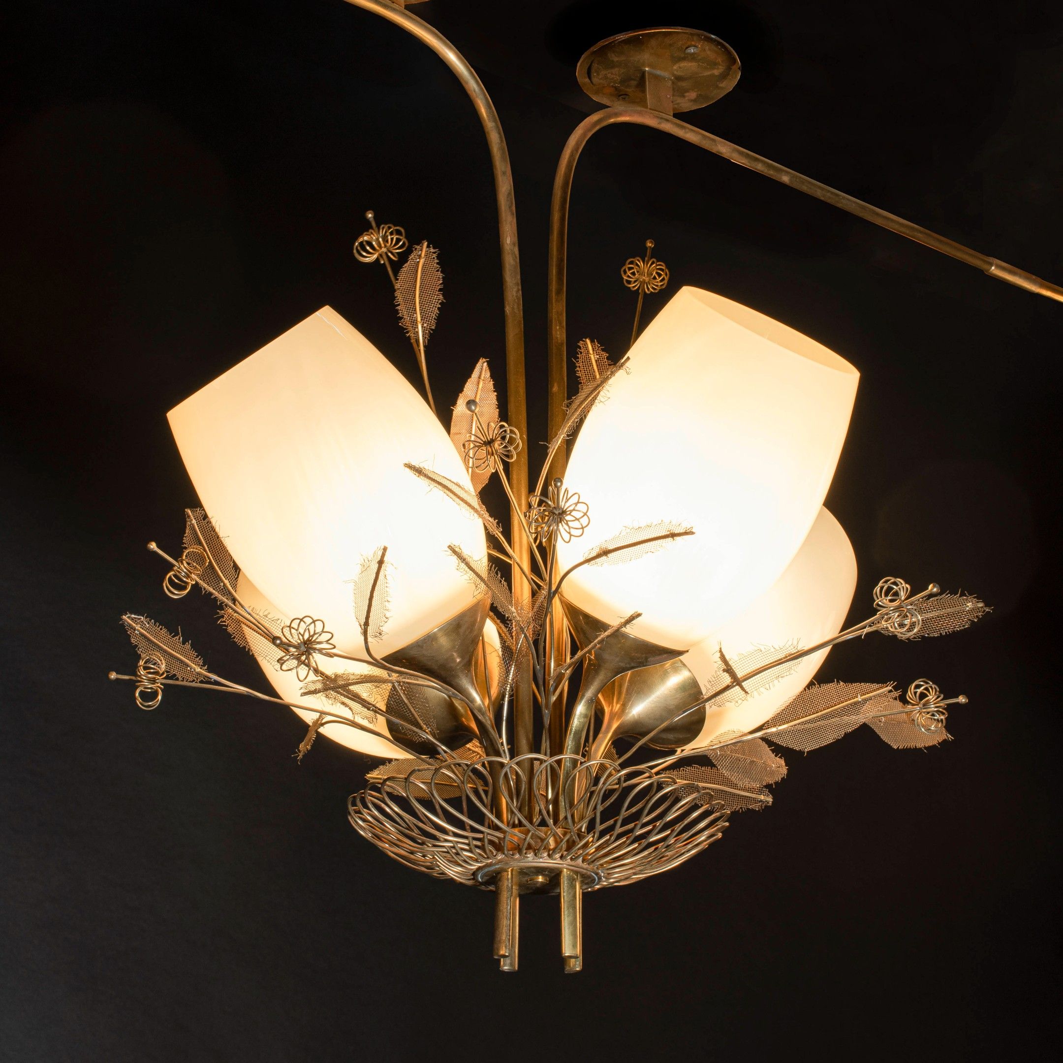 Paavo TYNELL Large four-light pendant lamp mod. 9029/4 - 1950 Brass and perforated metal structure, opaline glass diffusers Published by Taito Oy 59 × 330 × 44 cm Provenance : Model made for a cinema in Heinola, Finland Private collection, Helsinki Private collection, Paris Bibliography : Idman trade catalogue no. 153, Helsinki. Similar copy reproduced on p. 58 A brass, metal and opaline glass mod. 9029/4 ceiling lamp by Paavo Tynell for Taito Oy - 1950 23.23 × 129.92 × 17.32 in. Paavo TYNELL